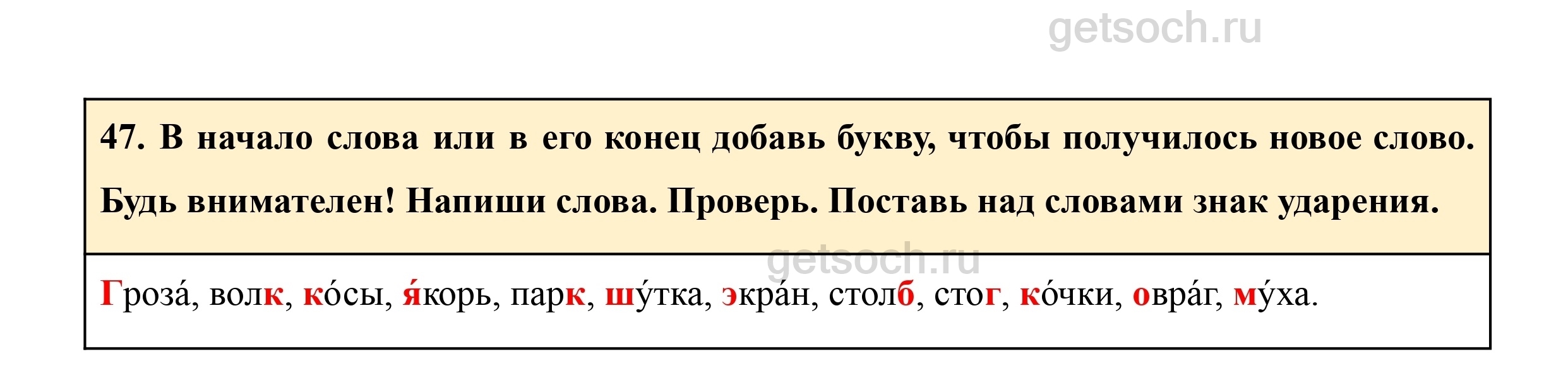 47. В начало слова или в его конец добавь букву, чтобы получилось новое слово. Будь внимателен! Напиши слова. Проверь. Поставь над словами знак ударения.