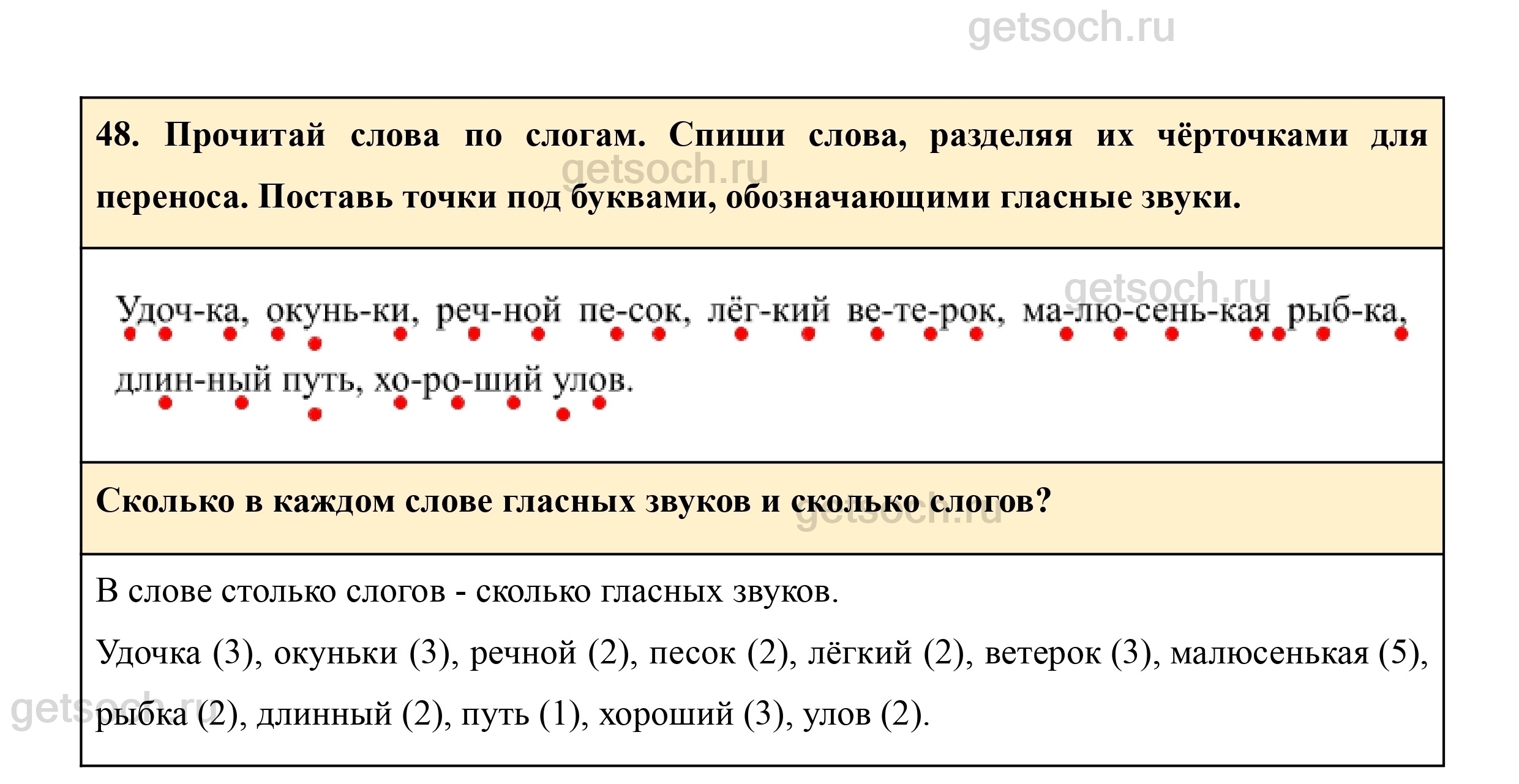 48. Прочитай слова по слогам. Спиши слова, разделяя их чёрточками для переноса. Поставь точки под буквами, обозначающими гласные звуки.