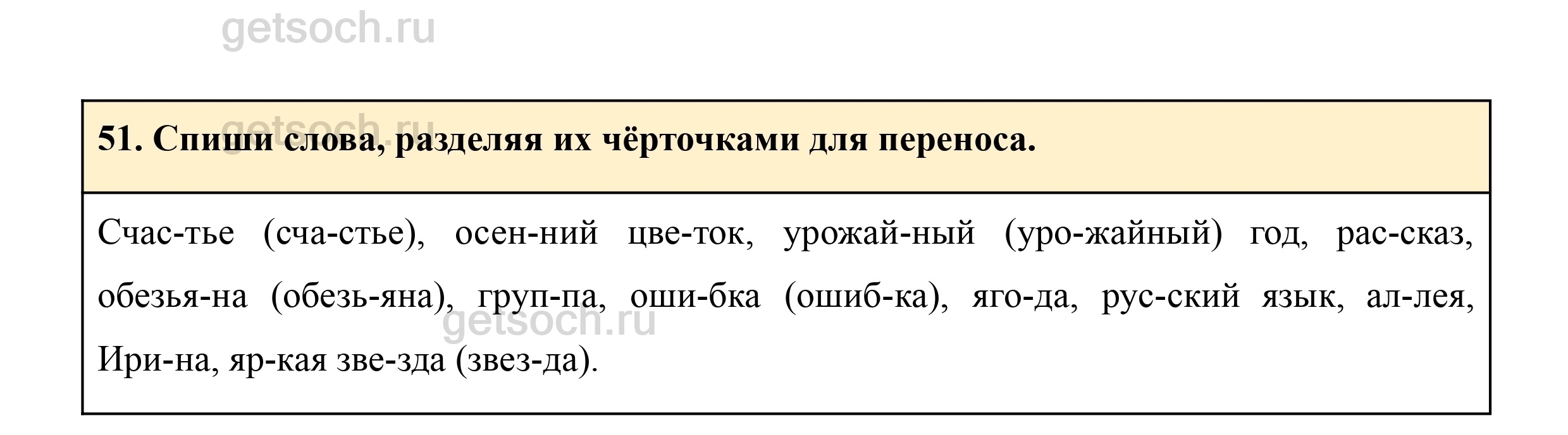 51. Спиши слова, разделяя их чёрточками для переноса.