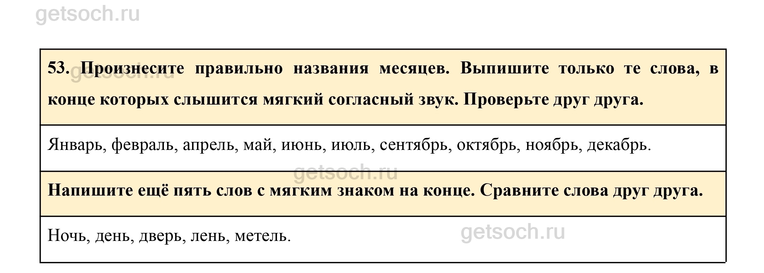 53. Произнесите правильно названия месяцев. Выпишите только те слова, в конце которых слышится мягкий согласный звук. Проверьте друг друга.