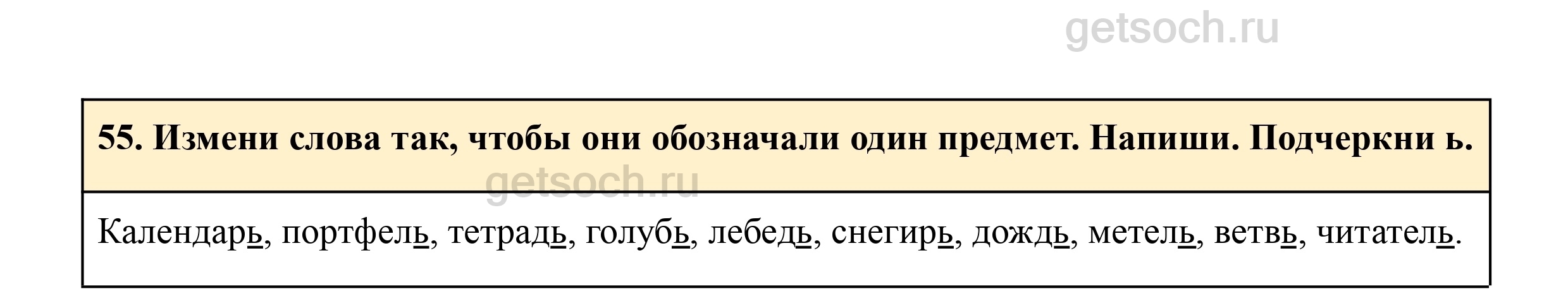 55. Измени слова так, чтобы они обозначали один предмет. Напиши. Подчеркни ь.