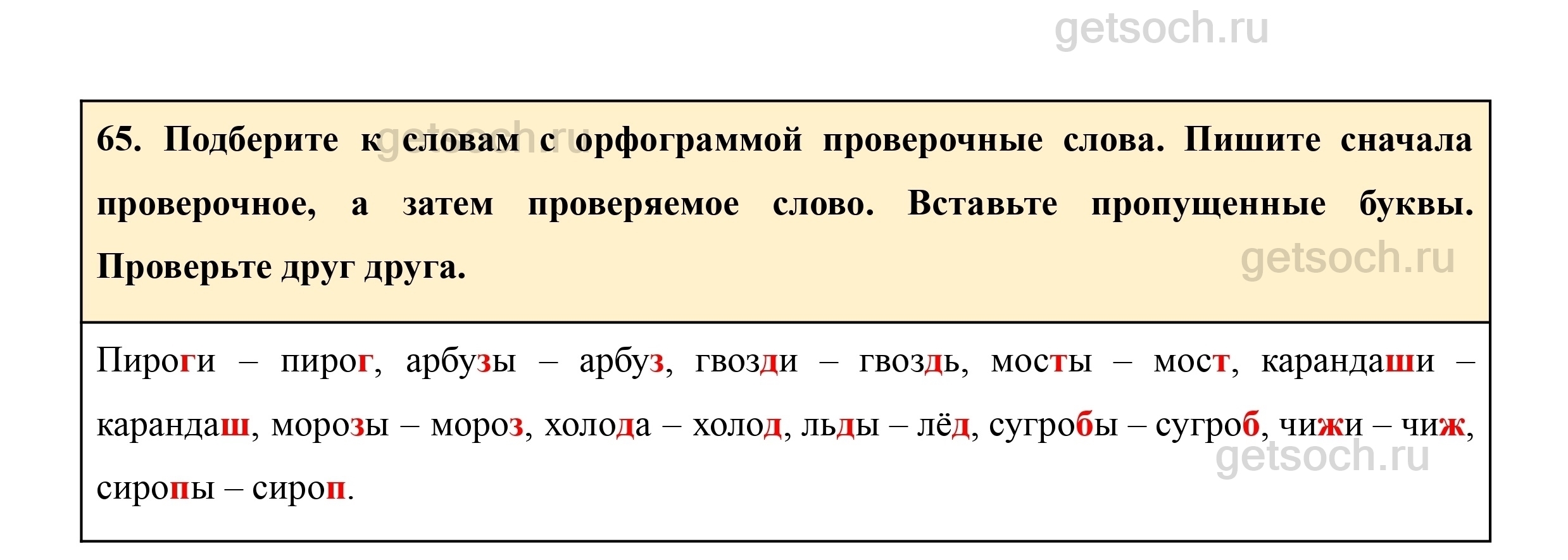 65. Подберите к словам с орфограммой проверочные слова. Пишите сначала проверочное, а затем проверяемое слово. Вставьте пропущенные буквы. Проверьте друг друга.