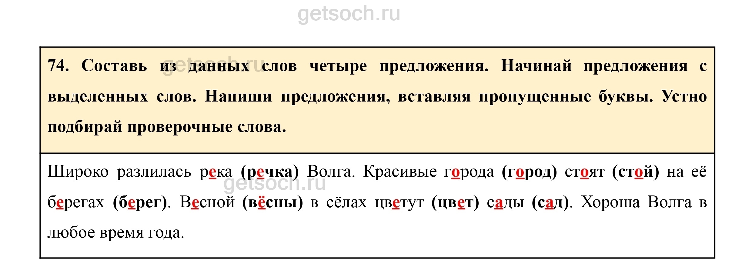 74. Составь из данных слов четыре предложения. Начинай предложения с выделенных слов. Напиши предложения, вставляя пропущенные буквы. Устно подбирай проверочные слова.
