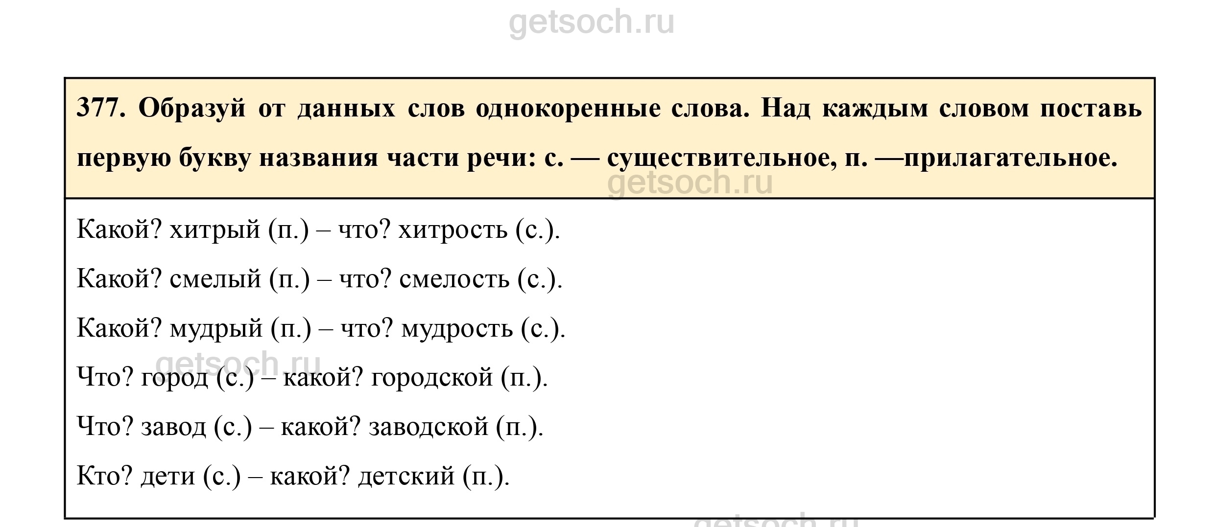 377. Образуй от данных слов однокоренные слова. Над каждым словом поставь первую букву названия части речи: с. — существительное, п. —прилагательное.