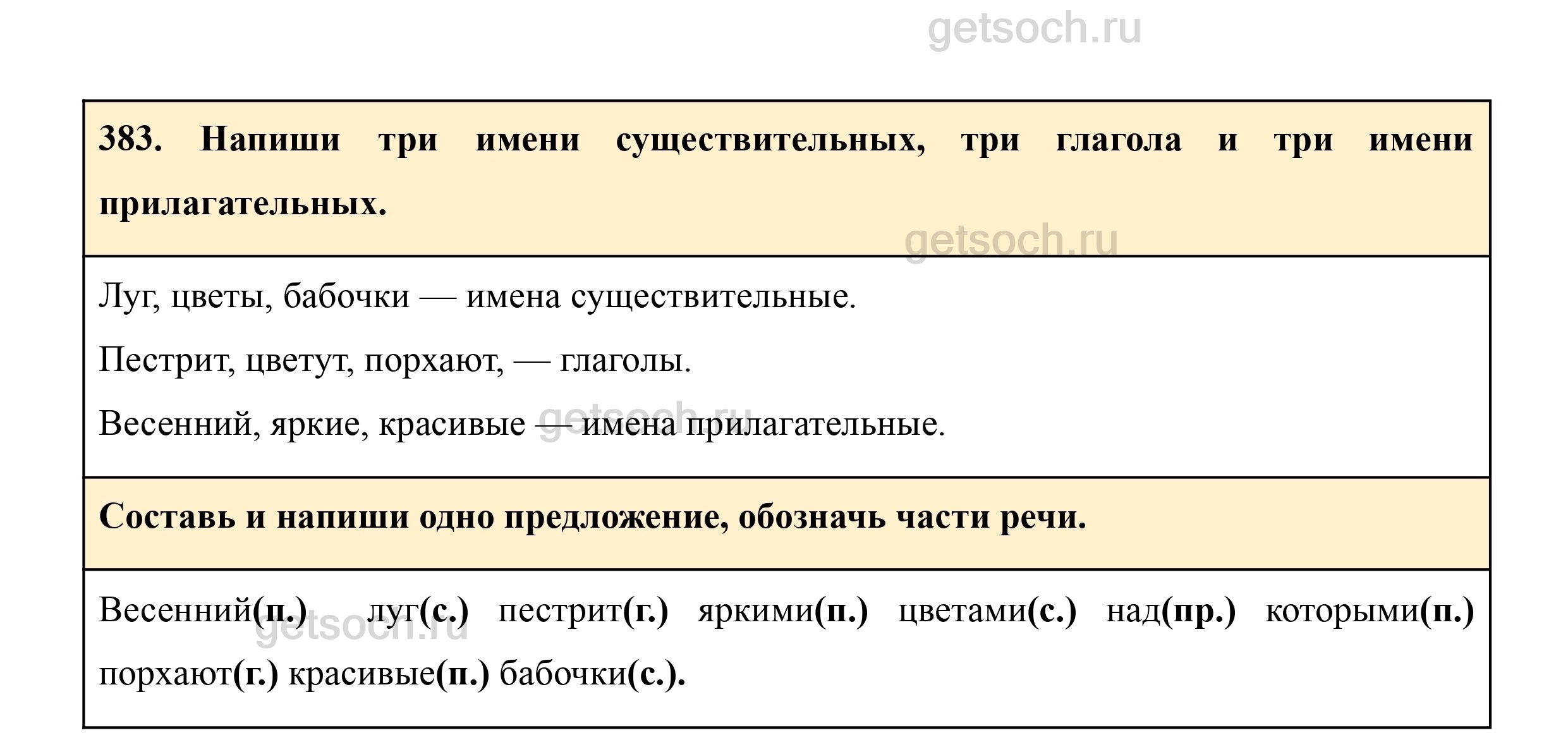 383. Напиши три имени существительных, три глагола и три имени прилагательных.