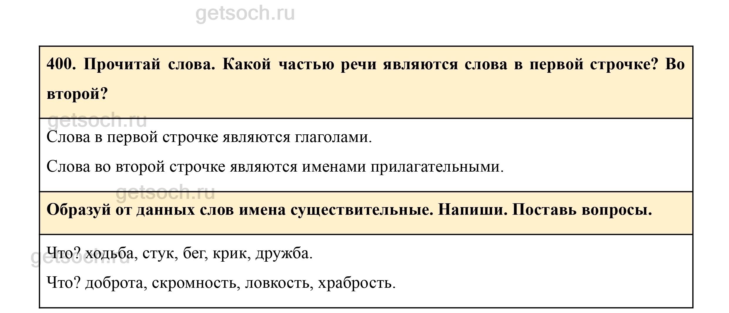 400. Прочитай слова. Какой частью речи являются слова в первой строчке? Во второй?