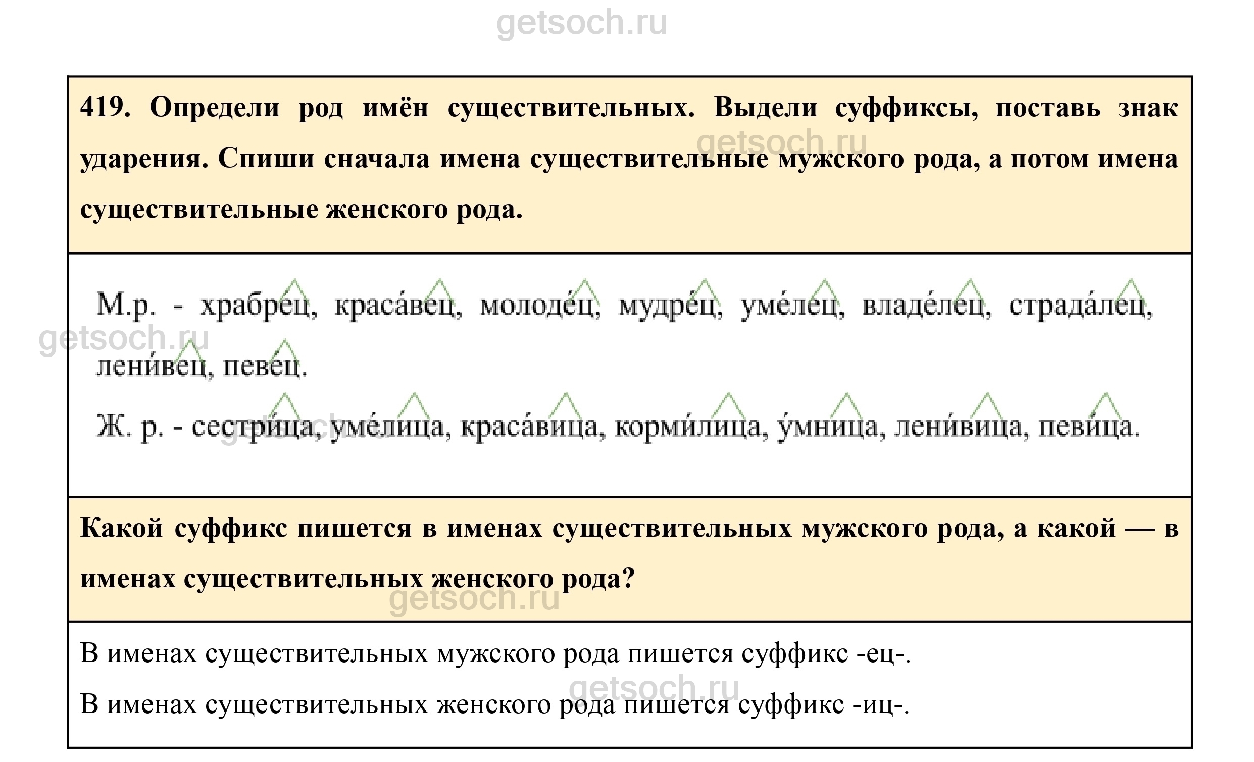 419. Определи род имён существительных. Выдели суффиксы, поставь знак ударения. Спиши сначала имена существительные мужского рода, а потом имена существительные женского рода.