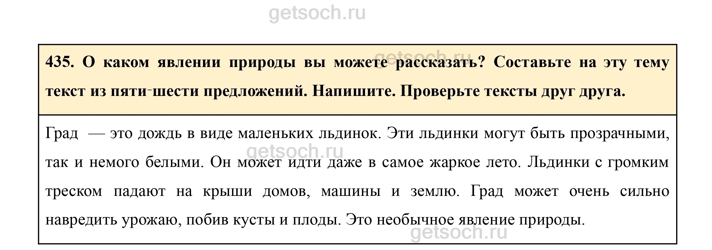 435. О каком явлении природы вы можете рассказать? Составьте на эту тему текст из пяти‑шести предложений. Напишите. Проверьте тексты друг друга.
