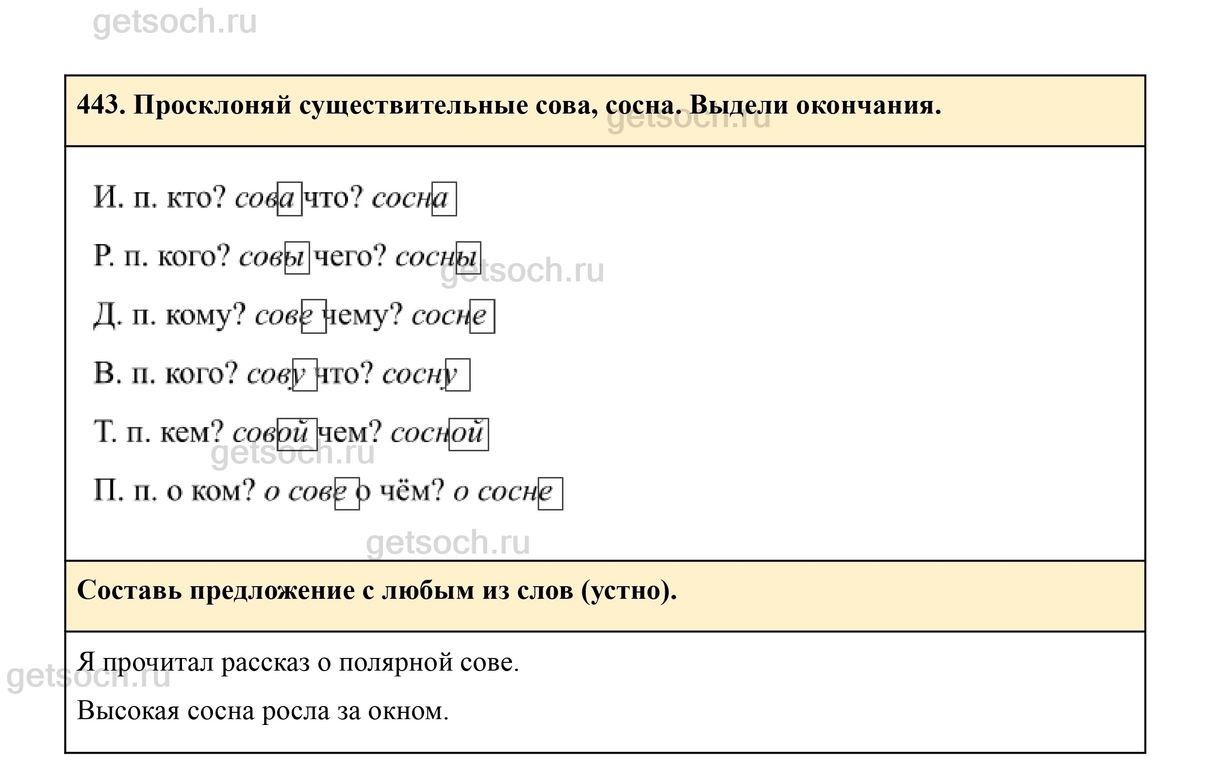 443. Просклоняй существительные сова, сосна. Выдели окончания.