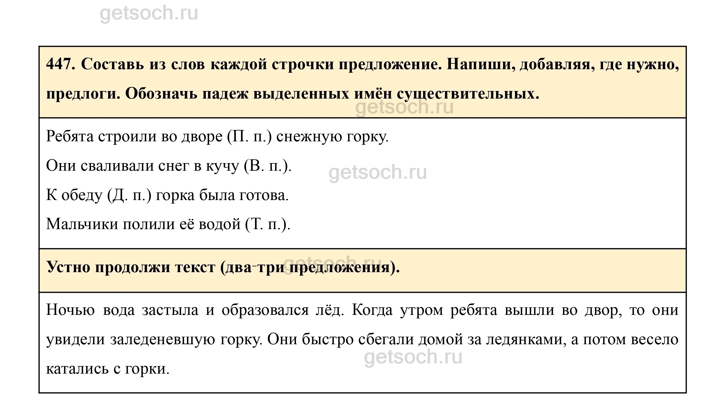 447. Составь из слов каждой строчки предложение. Напиши, добавляя, где нужно, предлоги. Обозначь падеж выделенных имён существительных.
