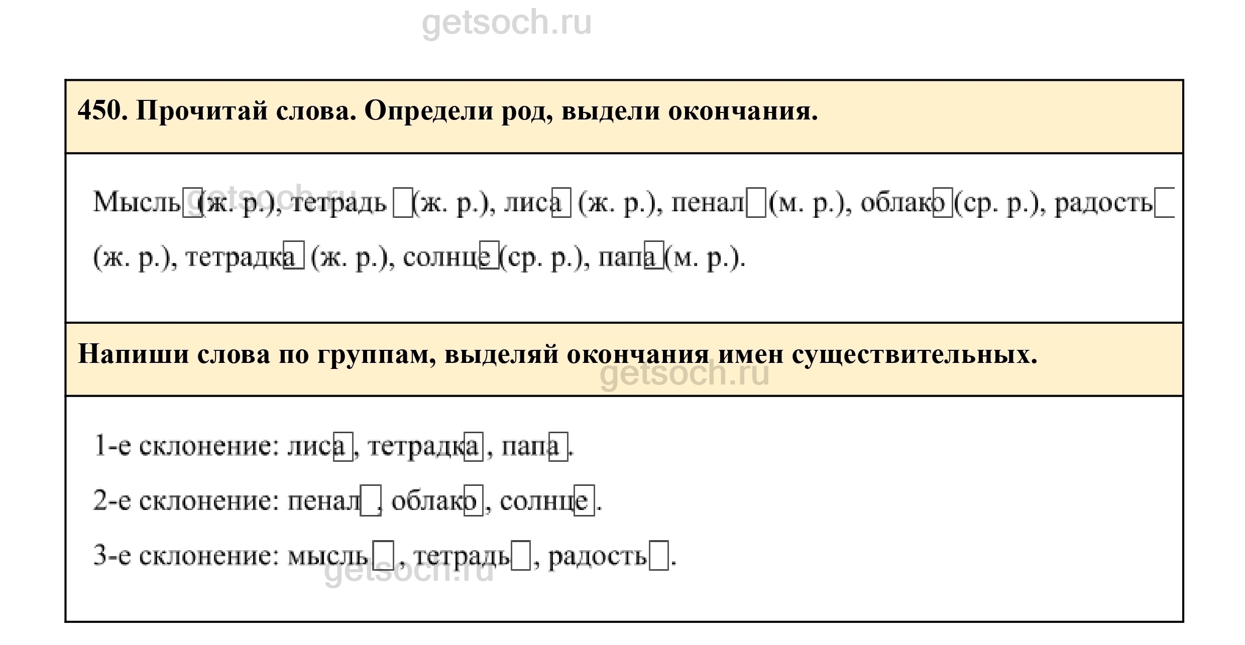 450. Прочитай слова. Определи род, выдели окончания.
