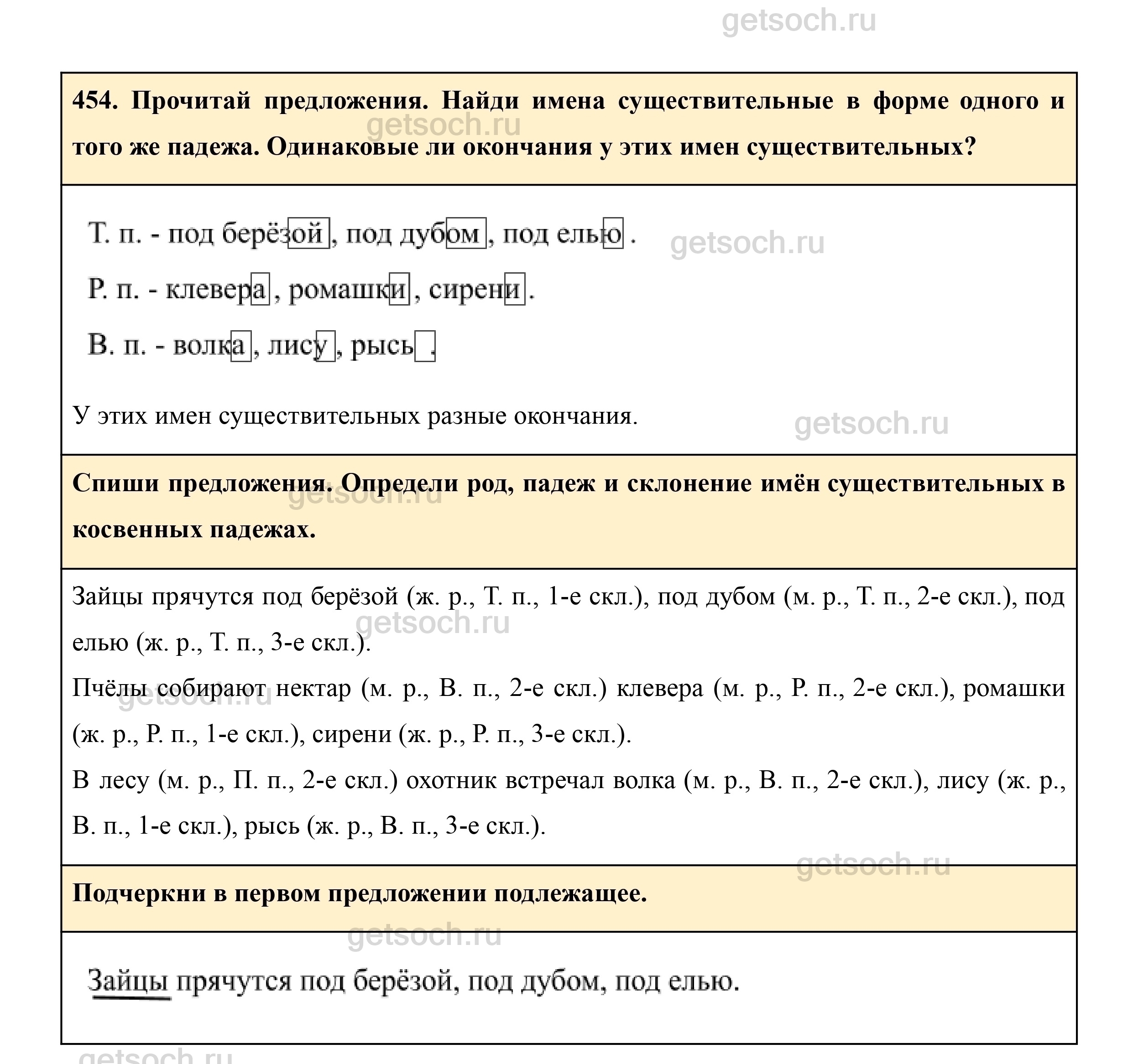 454. Прочитай предложения. Найди имена существительные в форме одного и того же падежа. Одинаковые ли окончания у этих имен существительных?
