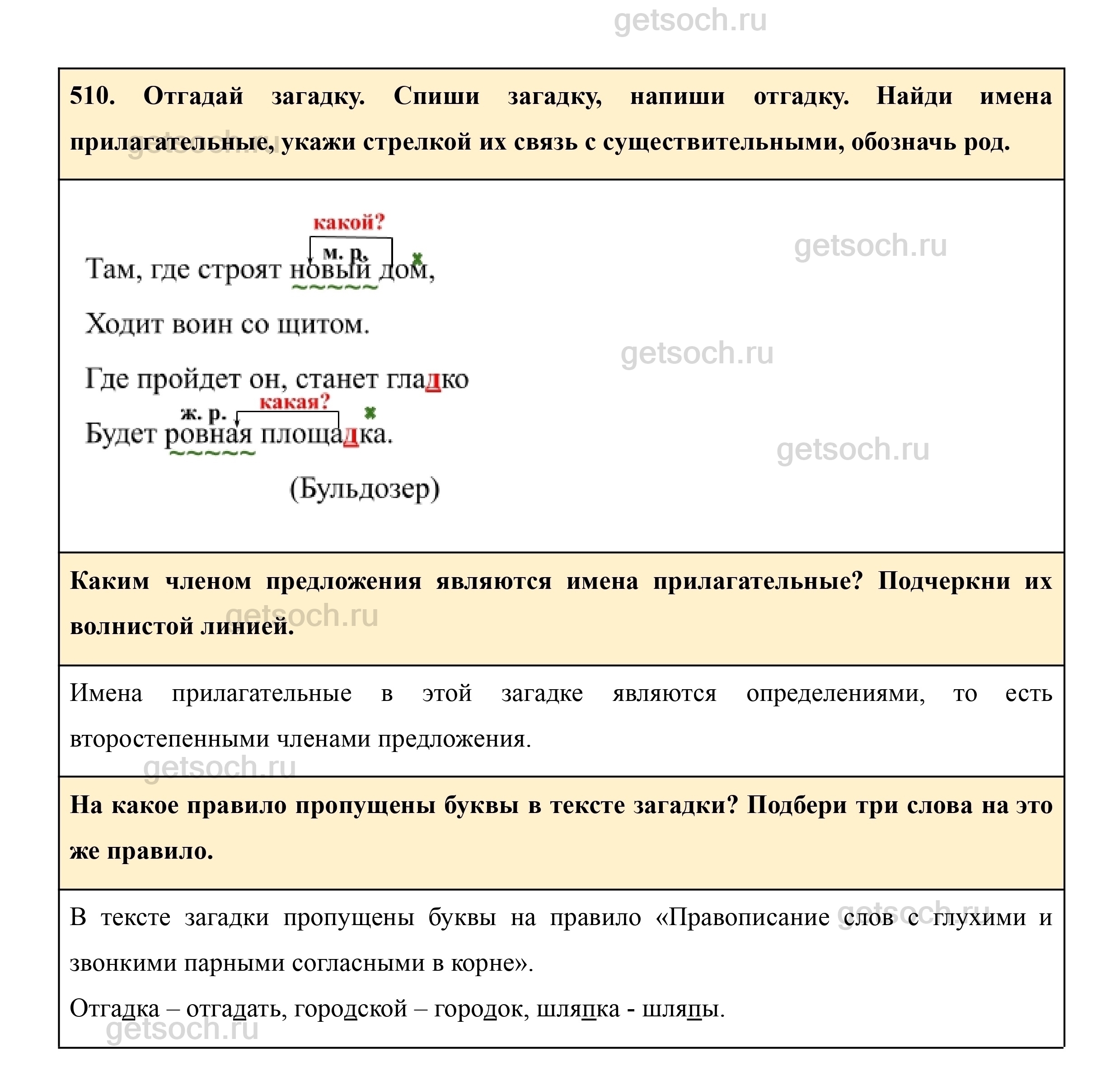 510. Отгадай загадку. Спиши загадку, напиши отгадку. Найди имена прилагательные, укажи стрелкой их связь с существительными, обозначь род.