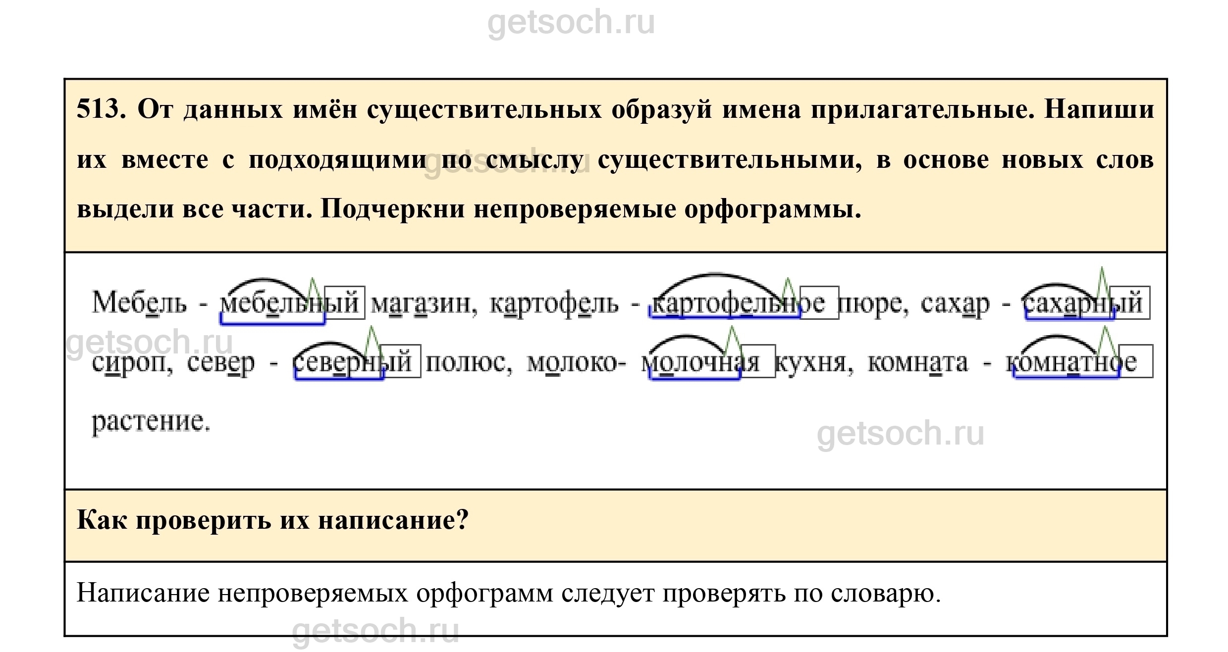 513. От данных имён существительных образуй имена прилагательные. Напиши их вместе с подходящими по смыслу существительными, в основе новых слов выдели все части. Подчеркни непроверяемые орфограммы.