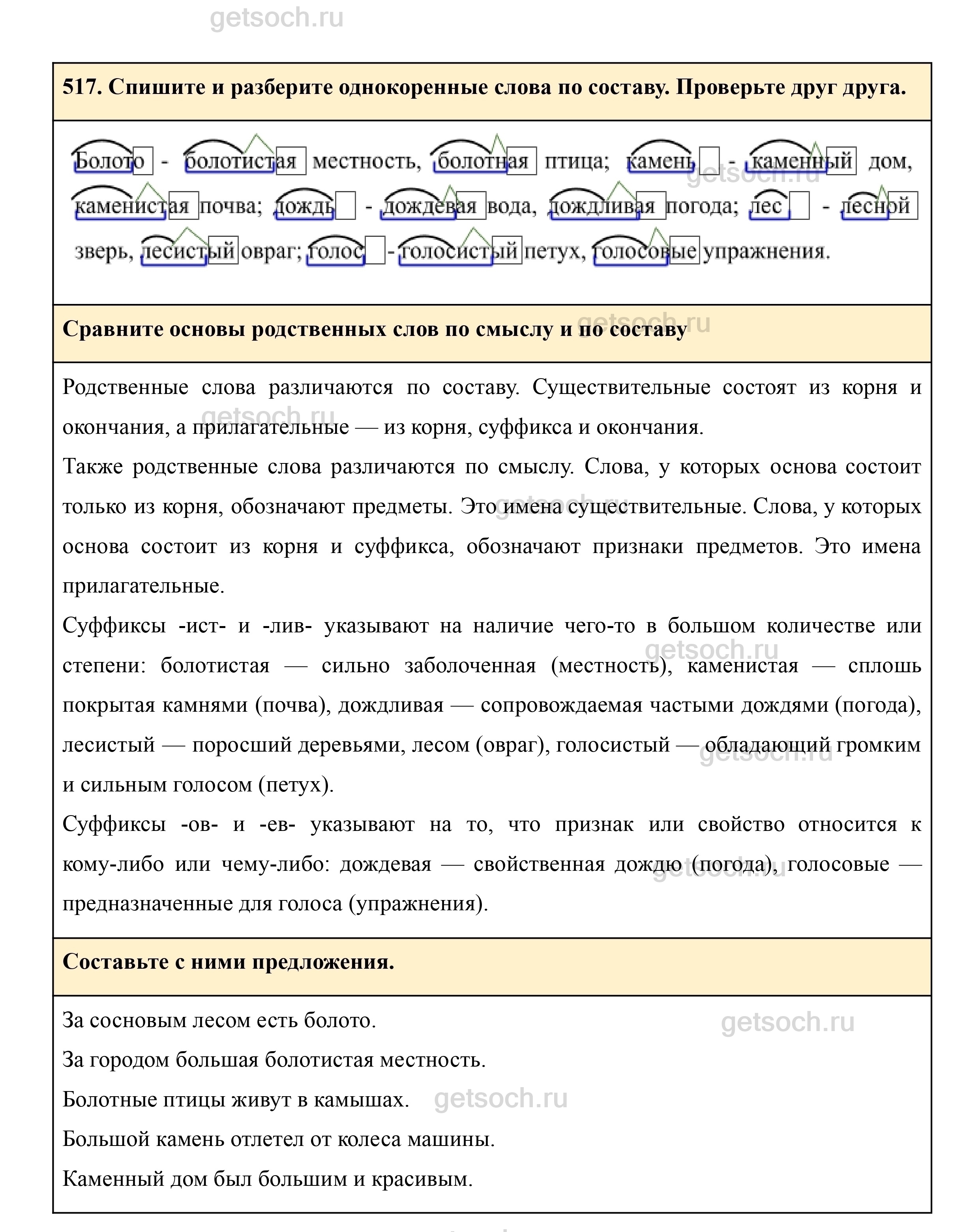 517. Спишите и разберите однокоренные слова по составу. Проверьте друг друга.