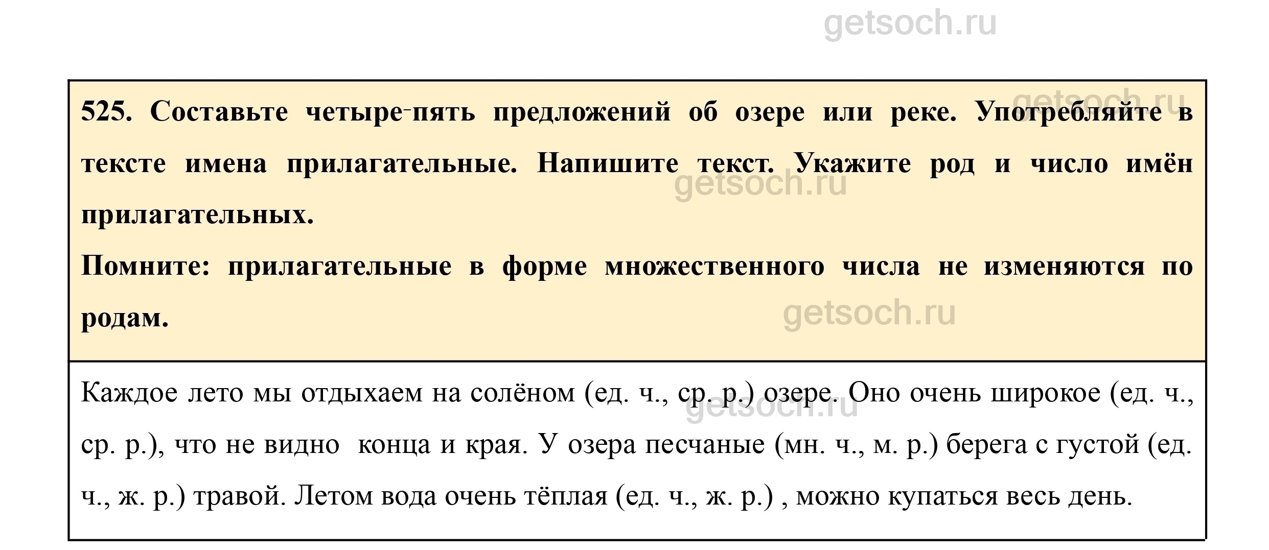 525. Составьте четыре‑пять предложений об озере или реке. Употребляйте в тексте имена прилагательные. Напишите текст. Укажите род и число имён прилагательных.