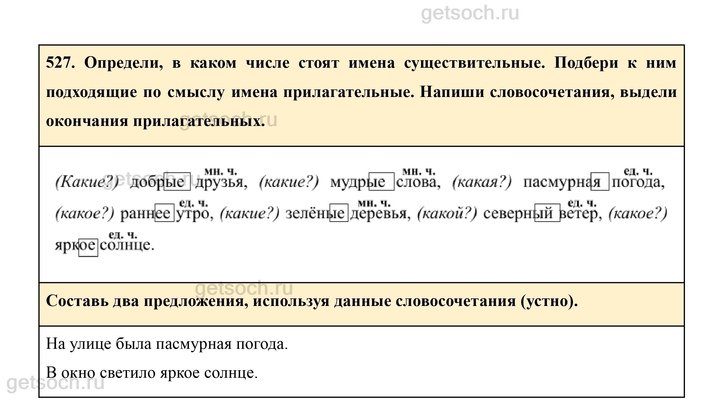 527. Определи, в каком числе стоят имена существительные. Подбери к ним подходящие по смыслу имена прилагательные. Напиши словосочетания, выдели окончания прилагательных.