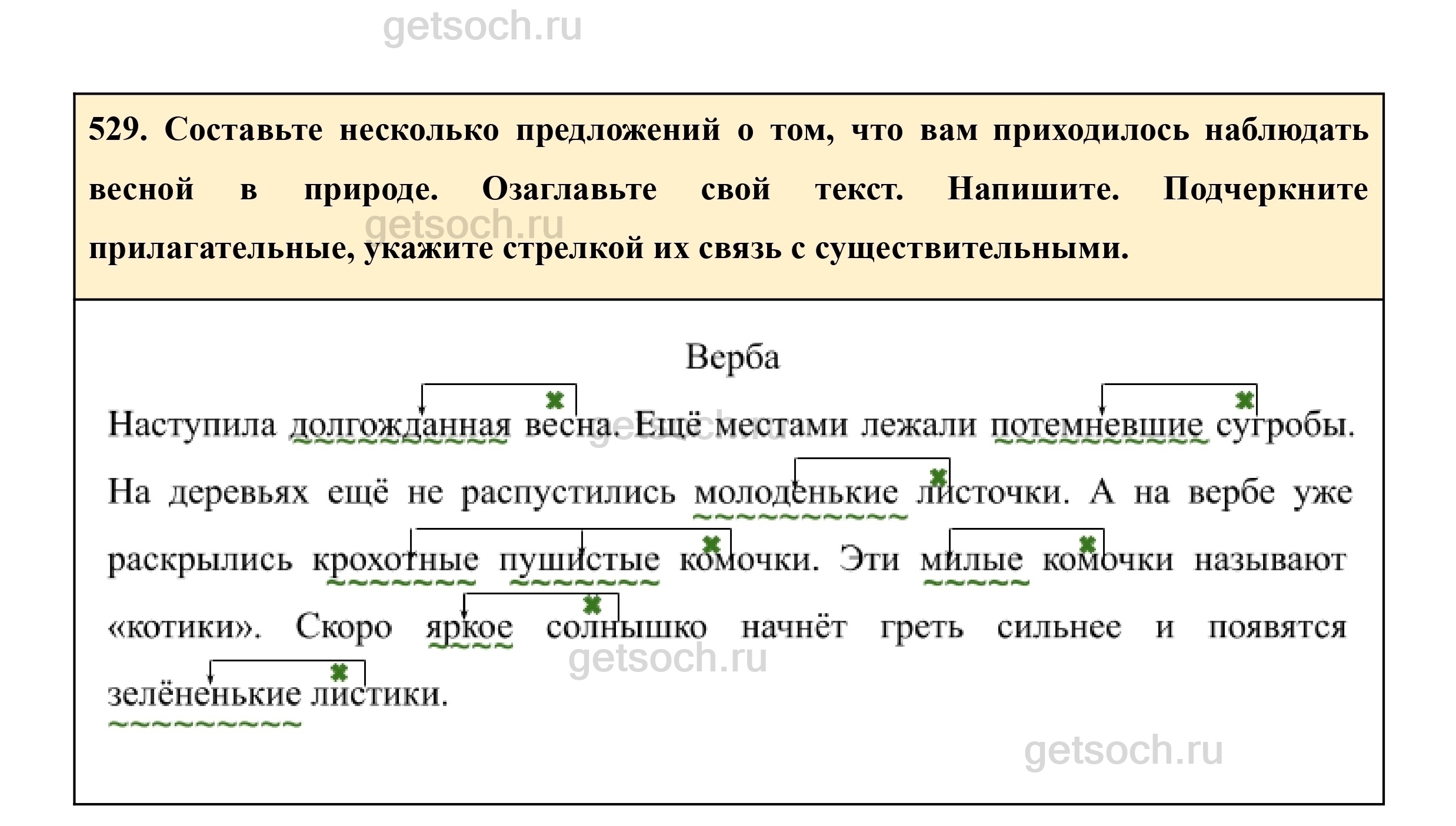 529. Составьте несколько предложений о том, что вам приходилось наблюдать весной в природе. Озаглавьте свой текст. Напишите. Подчеркните прилагательные, укажите стрелкой их связь с существительными.