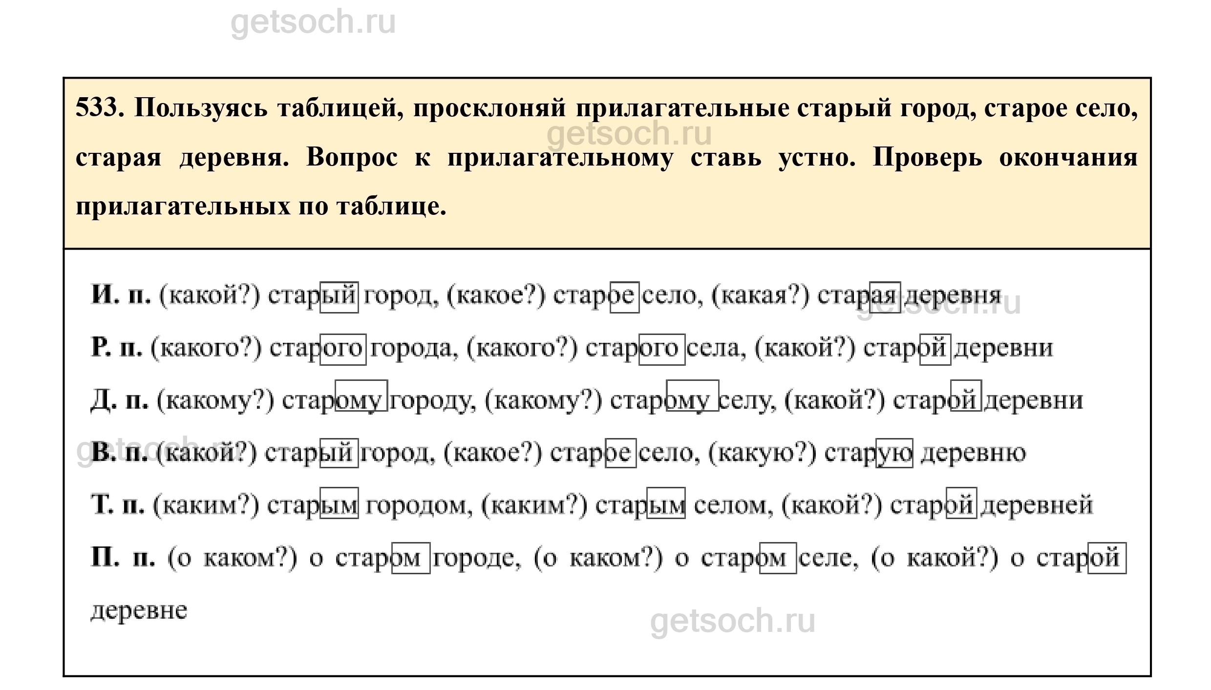 533. Пользуясь таблицей, просклоняй прилагательные старый город, старое село, старая деревня. Вопрос к прилагательному ставь устно. Проверь окончания прилагательных по таблице.