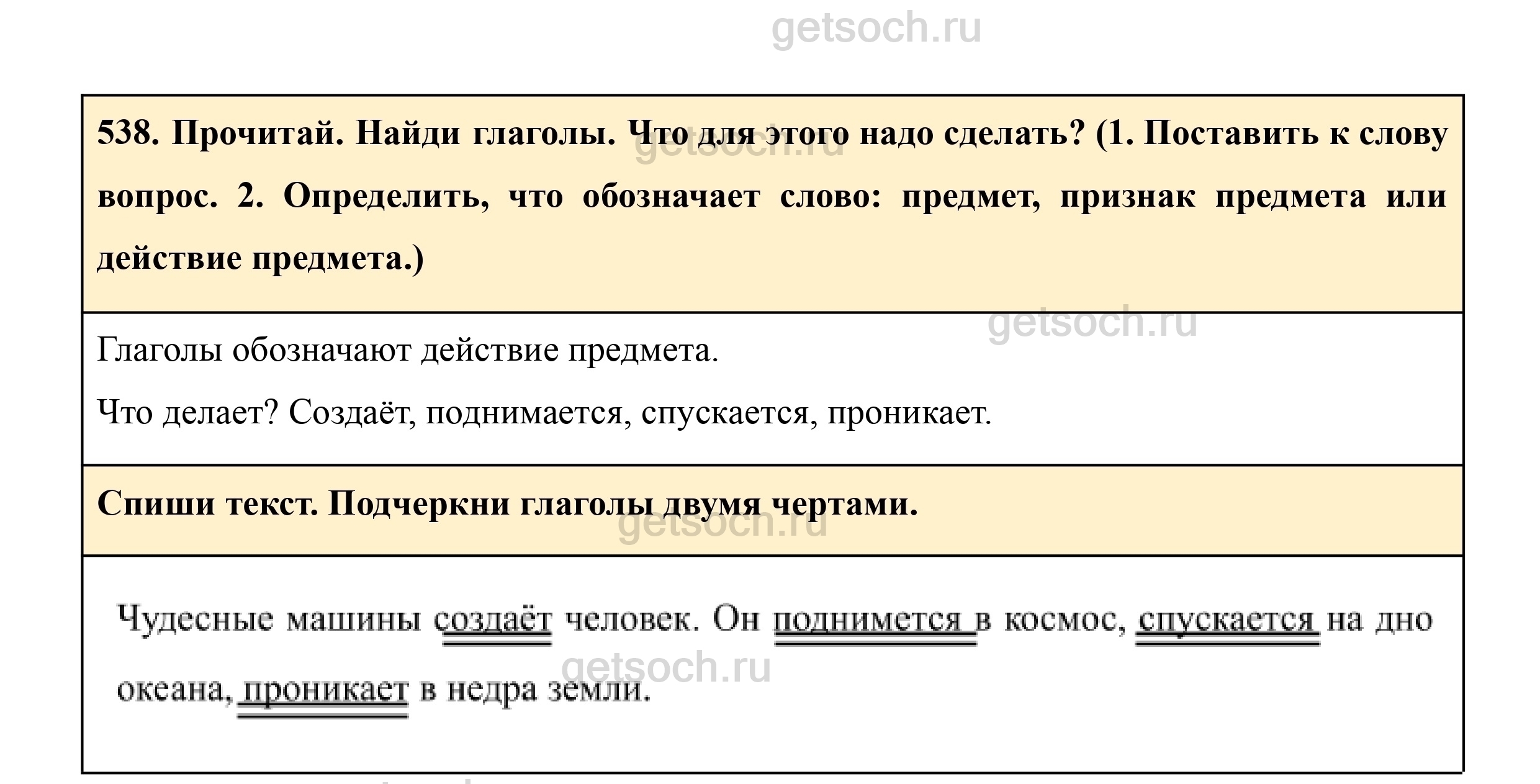 538. Прочитай. Найди глаголы. Что для этого надо сделать? (1. Поставить к слову вопрос. 2. Определить, что обозначает слово: предмет, признак предмета или действие предмета.)