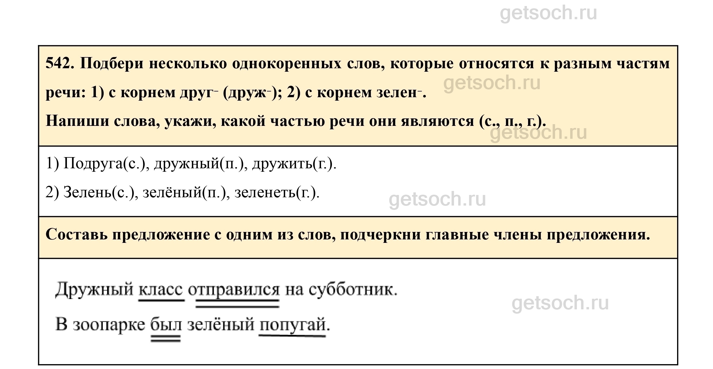 542. Подбери несколько однокоренных слов, которые относятся к разным частям речи: 1) с корнем друг‑ (друж‑); 2) с корнем зелен‑.