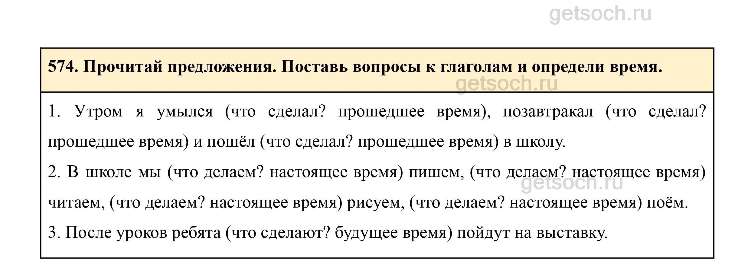 574. Прочитай предложения. Поставь вопросы к глаголам и определи время.