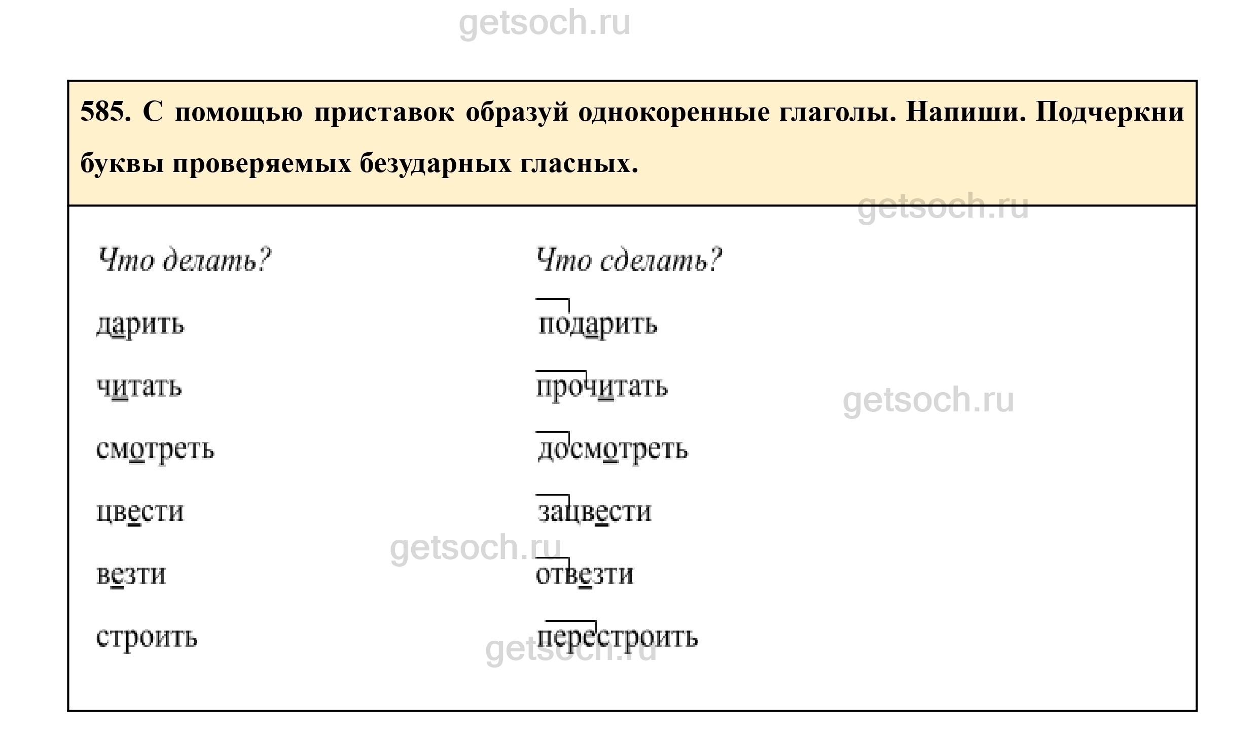 585. С помощью приставок образуй однокоренные глаголы. Напиши. Подчеркни буквы проверяемых безударных гласных.