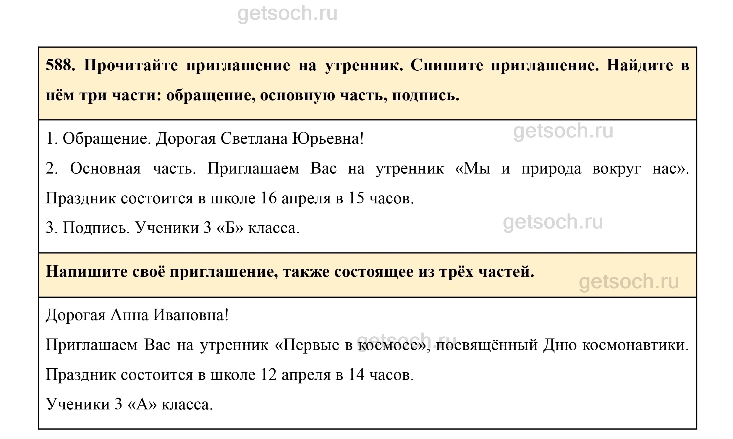 588. Прочитайте приглашение на утренник. Спишите приглашение. Найдите в нём три части: обращение, основную часть, подпись.