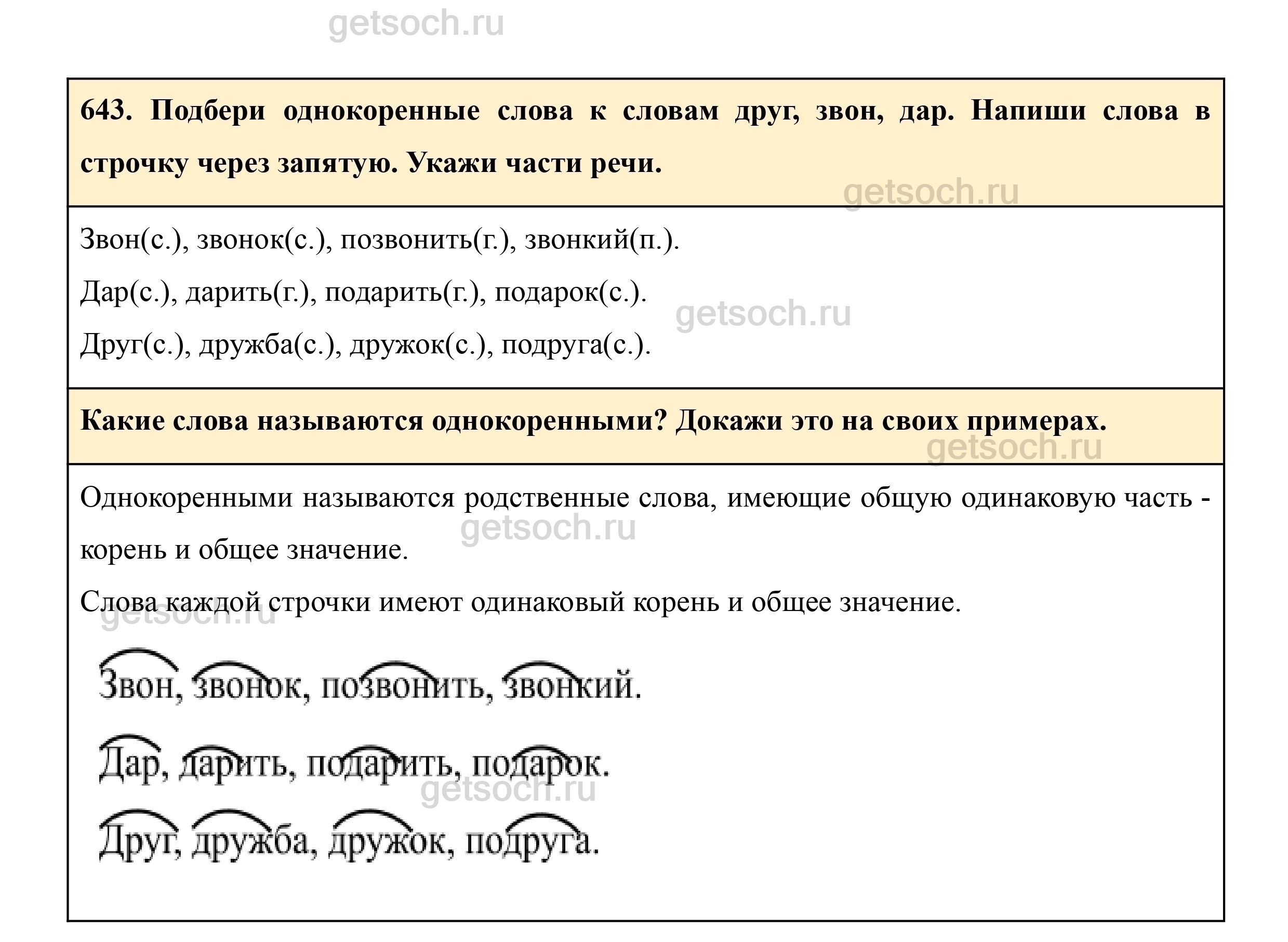 643. Подбери однокоренные слова к словам друг, звон, дар. Напиши слова в строчку через запятую. Укажи части речи.