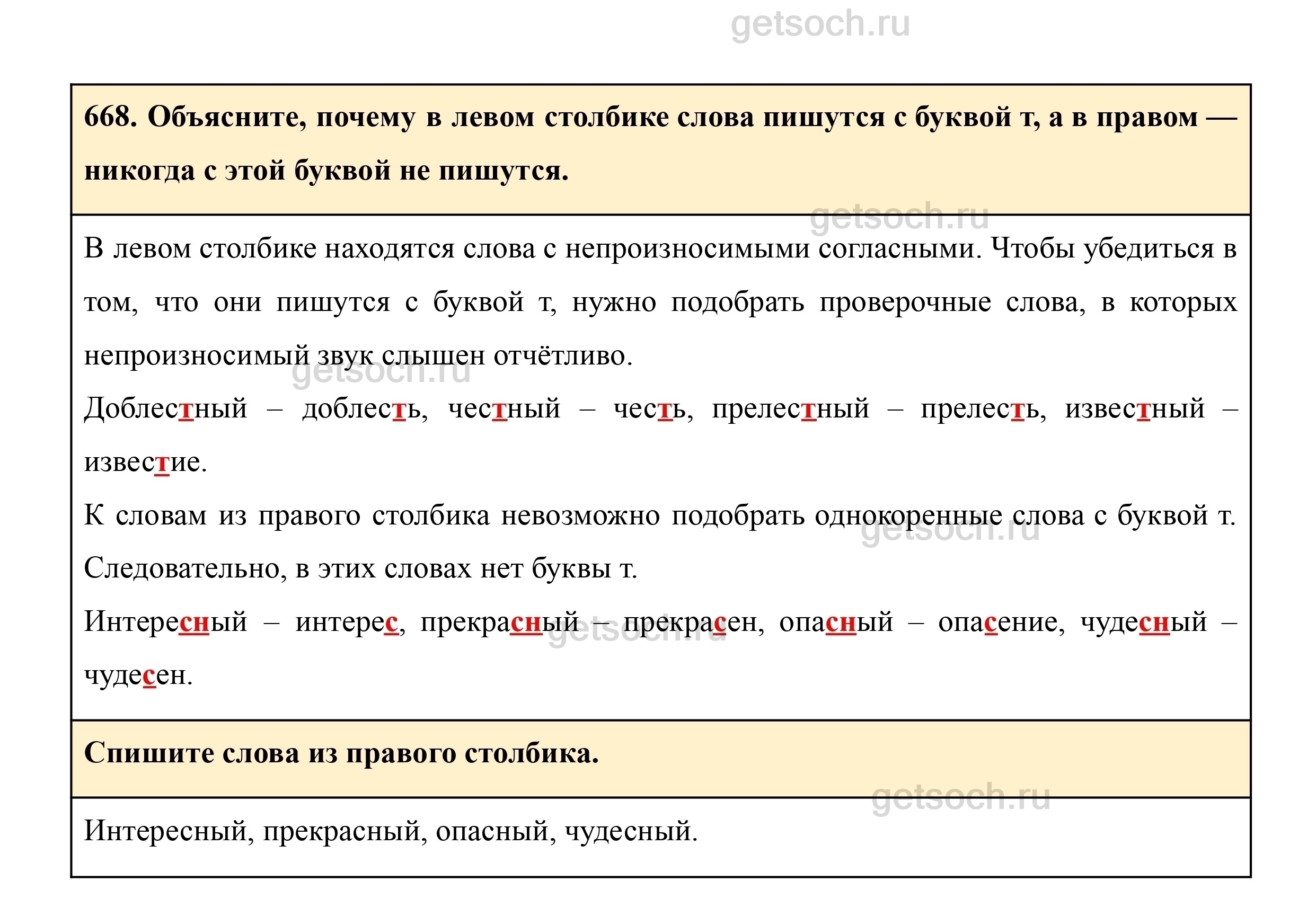 668. Объясните, почему в левом столбике слова пишутся с буквой т, а в правом — никогда с этой буквой не пишутся.