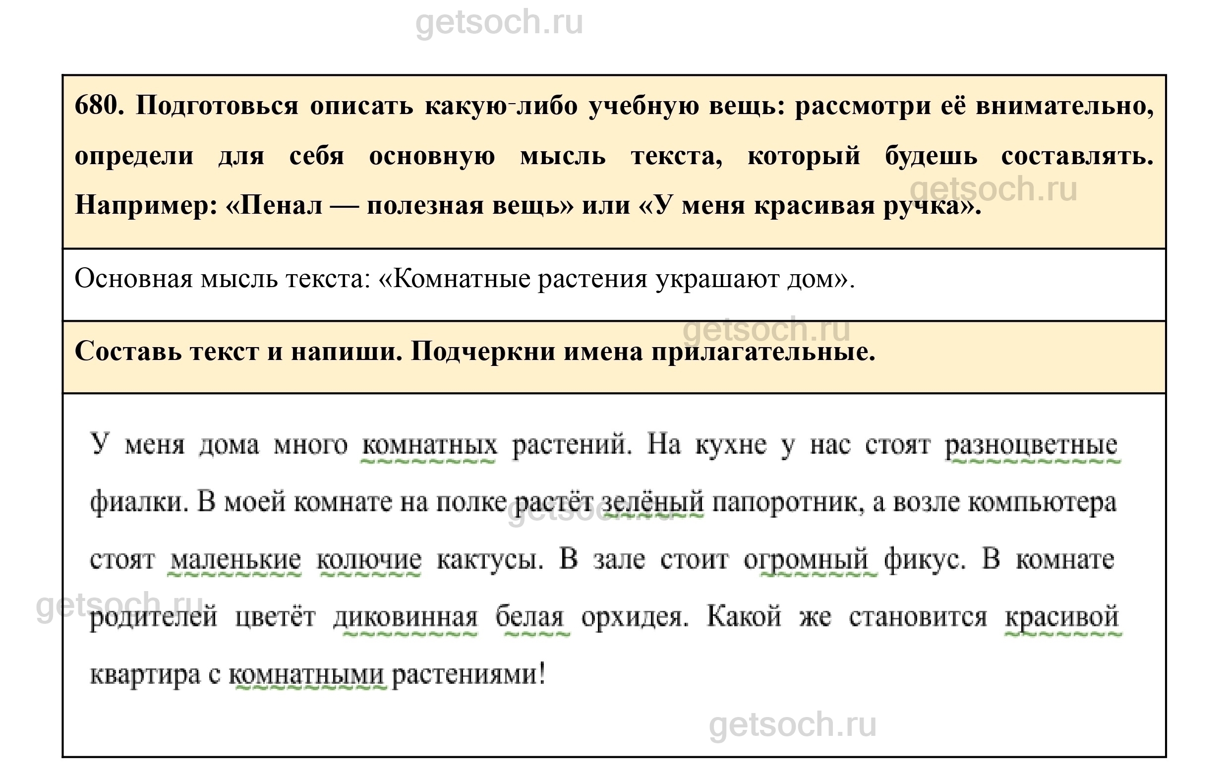 680. Подготовься описать какую‑либо учебную вещь: рассмотри её внимательно, определи для себя основную мысль текста, который будешь составлять. Например: «Пенал — полезная вещь» или «У меня красивая ручка».