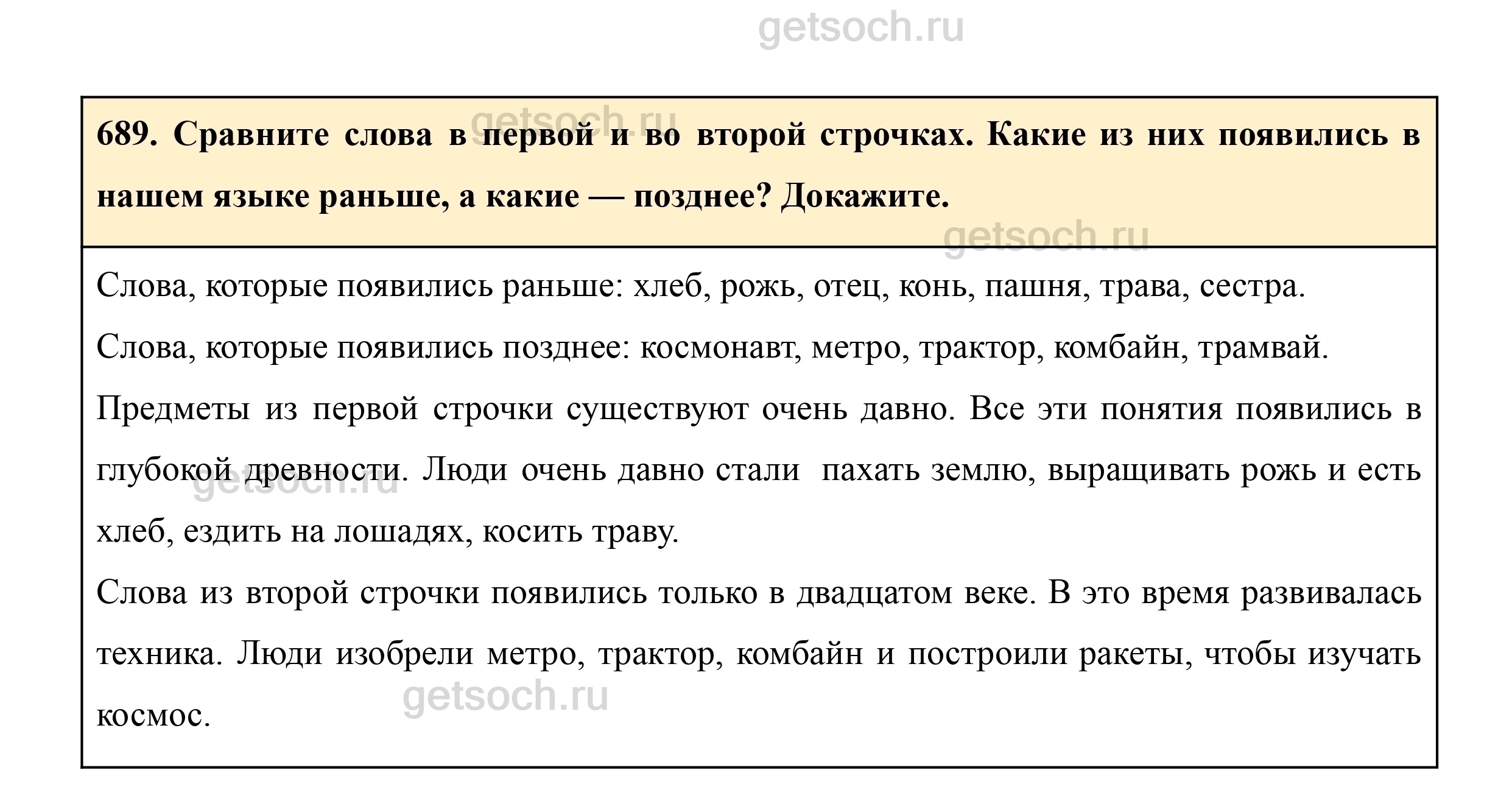 689. Сравните слова в первой и во второй строчках. Какие из них появились в нашем языке раньше, а какие — позднее? Докажите.