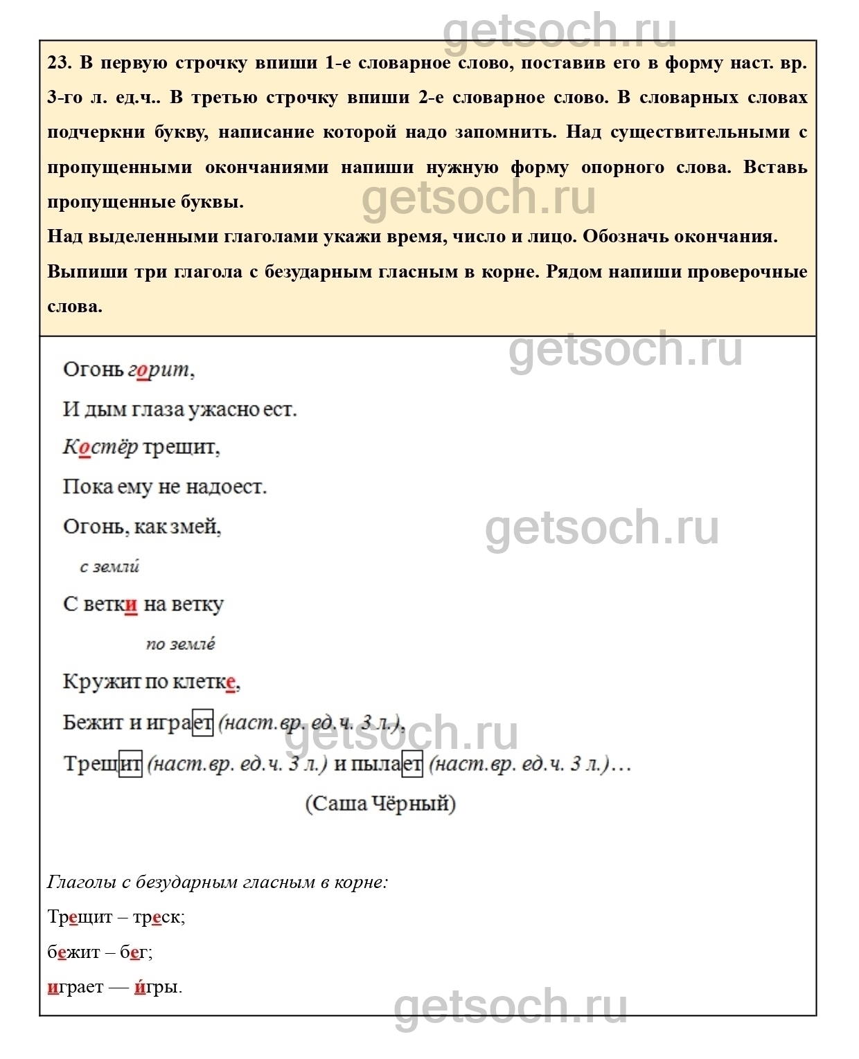 23. В первую строчку впиши 1-е словарное слово, поставив его в форму наст. вр. 3-го л. ед.ч.. В третью строчку впиши 2-е словарное слово. В словарных словах подчеркни букву, написание которой надо запомнить. Над существительными с пропущенными окончаниями напиши нужную форму опорного слова. Вставь пропущенные буквы.