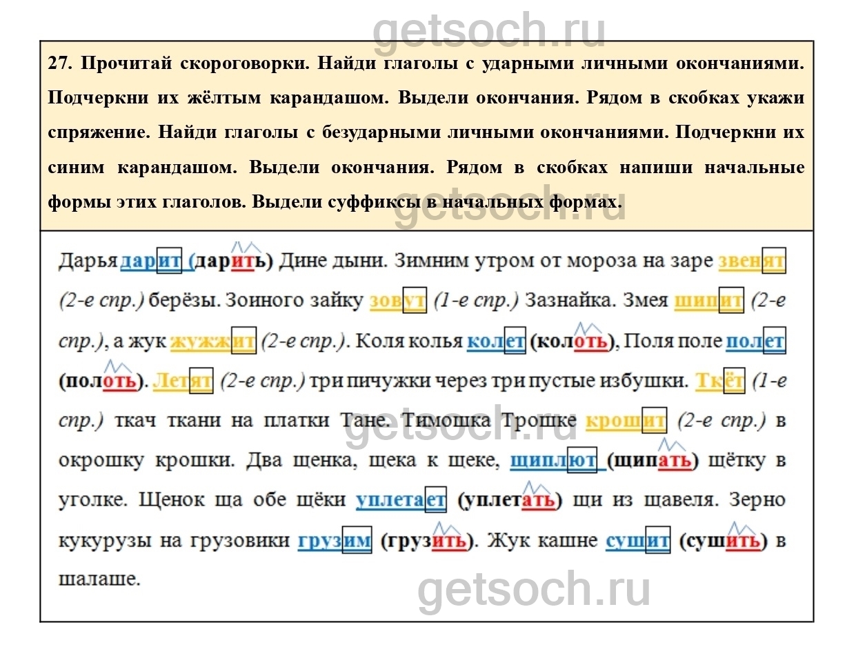 27. Прочитай скороговорки. Найди глаголы с ударными личными окончаниями. Подчеркни их жёлтым карандашом. Выдели окончания. Рядом в скобках укажи спряжение. Найди глаголы с безударными личными окончаниями. Подчеркни их синим карандашом. Выдели окончания. Рядом в скобках напиши начальные формы этих глаголов. Выдели суффиксы в начальных формах.