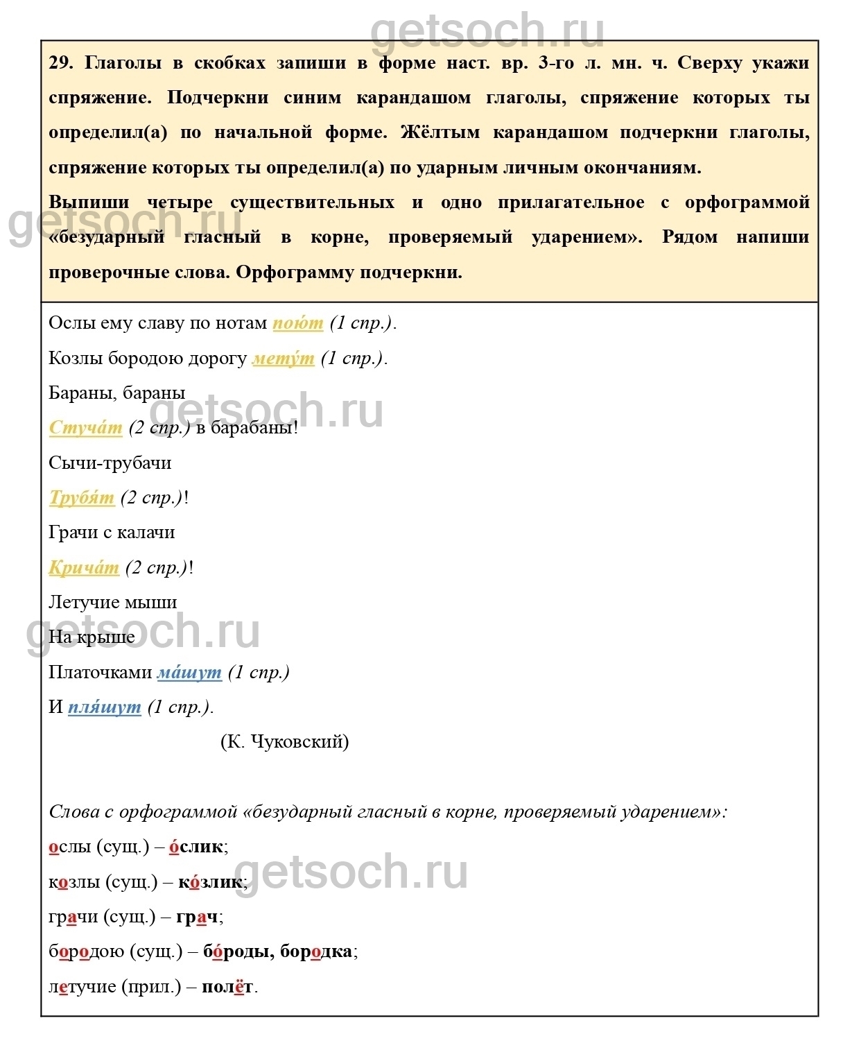 29. Глаголы в скобках запиши в форме наст. вр. 3-го л. мн. ч. Сверху укажи спряжение. Подчеркни синим карандашом глаголы, спряжение которых ты определил(а) по начальной форме. Жёлтым карандашом подчеркни глаголы, спряжение которых ты определил(а) по ударным личным окончаниям.