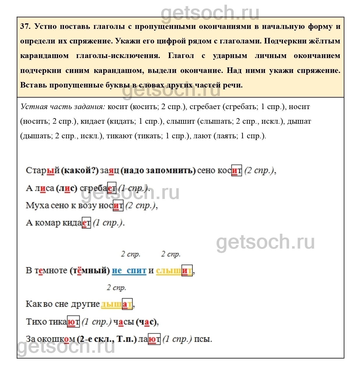 37. Устно поставь глаголы с пропущенными окончаниями в начальную форму и определи их спряжение. Укажи его цифрой рядом с глаголами. Подчеркни жёлтым карандашом глаголы-исключения. Глагол с ударным личным окончанием подчеркни синим карандашом, выдели окончание. Над ними укажи спряжение. Вставь пропущенные буквы в словах других частей речи.