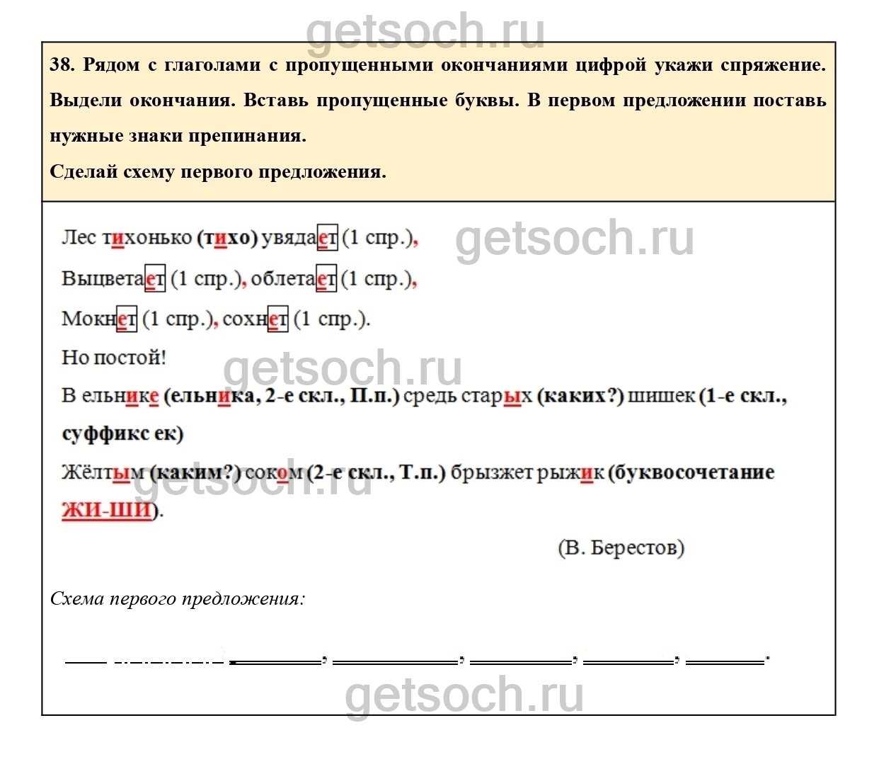 38. Рядом c глаголами с пропущенными окончаниями цифрой укажи спряжение. Выдели окончания. Вставь пропущенные буквы. В первом предложении поставь нужные знаки препинания.