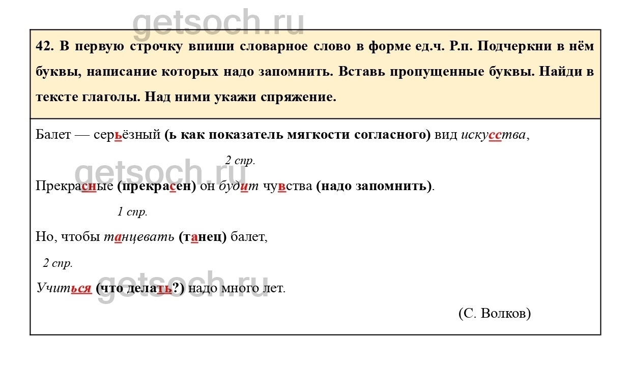 42. В первую строчку впиши словарное слово в форме ед.ч. Р.п. Подчеркни в нём буквы, написание которых надо запомнить. Вставь пропущенные буквы. Найди в тексте глаголы. Над ними укажи спряжение.