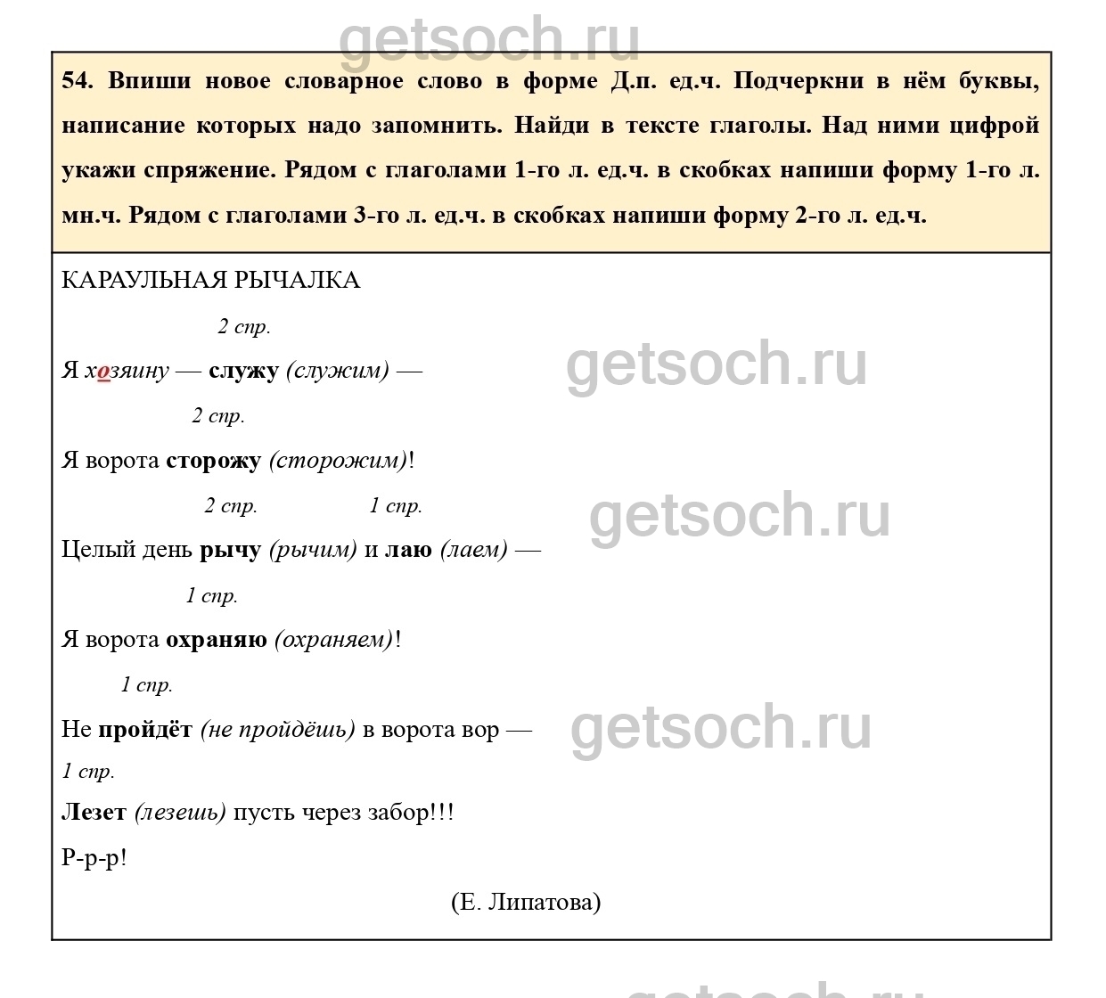 54. Впиши новое словарное слово в форме Д.п. ед.ч. Подчеркни в нём буквы, написание которых надо запомнить. Найди в тексте глаголы. Над ними цифрой укажи спряжение. Рядом с глаголами 1-го л. ед.ч. в скобках напиши форму 1-го л. мн.ч. Рядом с глаголами 3-го л. ед.ч. в скобках напиши форму 2-го л. ед.ч.