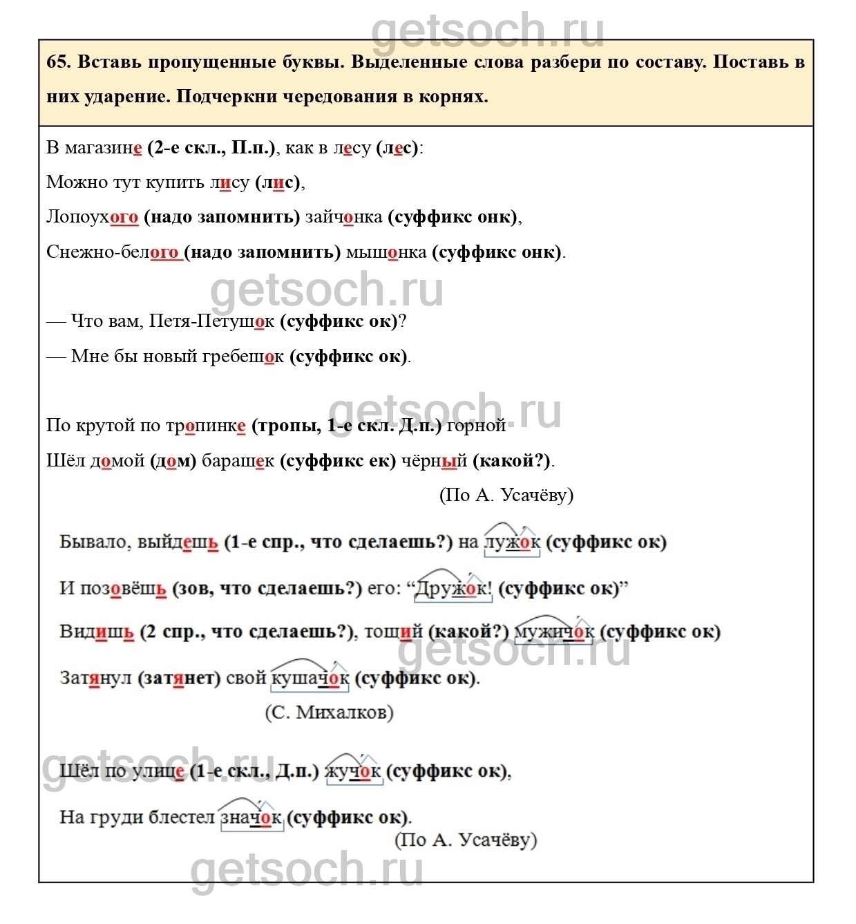 65. Вставь пропущенные буквы. Выделенные слова разбери по составу. Поставь в них ударение. Подчеркни чередования в корнях.