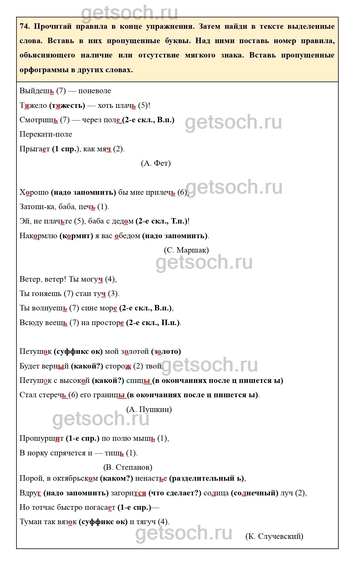 74. Прочитай правила в конце упражнения. Затем найди в тексте выделенные слова. Вставь в них пропущенные буквы. Над ними поставь номер правила, объясняющего наличие или отсутствие мягкого знака. Вставь пропущенные орфограммы в других словах.