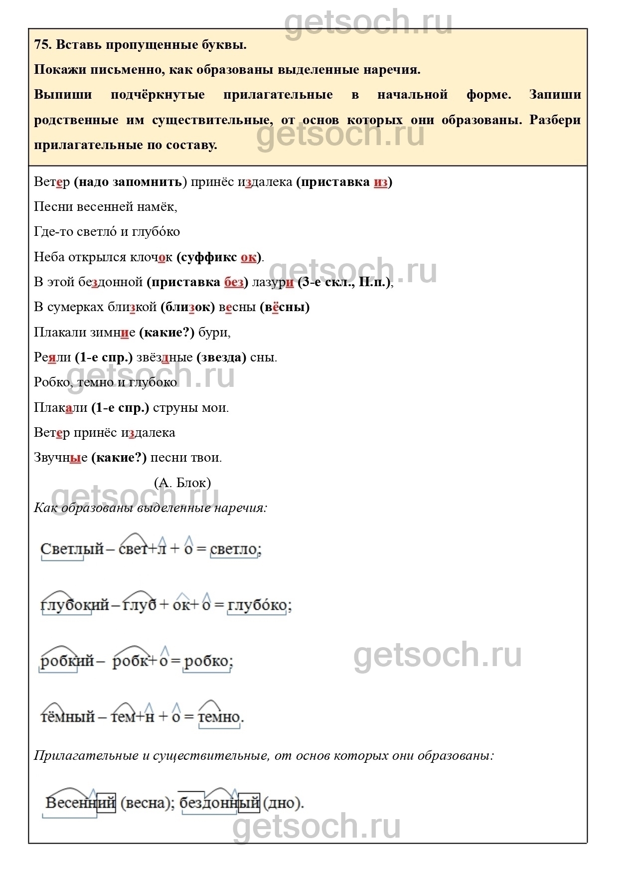 Рассмотрим ответы на Упражнение 75 из тетради для самостоятельной работы по русскому языку для 4 класса Байковой
