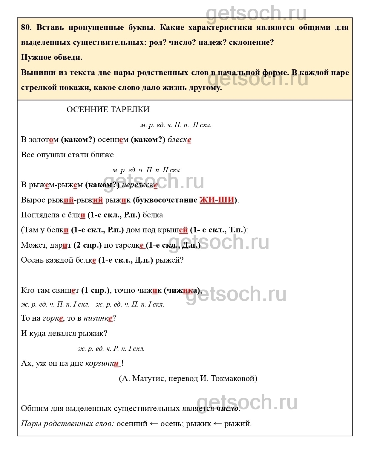 80. Вставь пропущенные буквы. Какие характеристики являются общими для выделенных существительных: род? число? падеж? склонение?