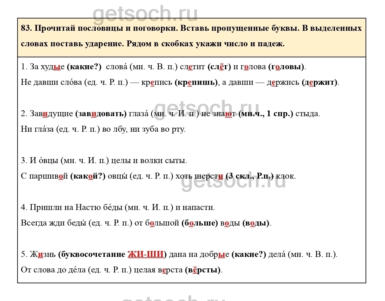 83. Прочитай пословицы и поговорки. Вставь пропущенные буквы. В выделенных словах поставь ударение. Рядом в скобках укажи число и падеж.