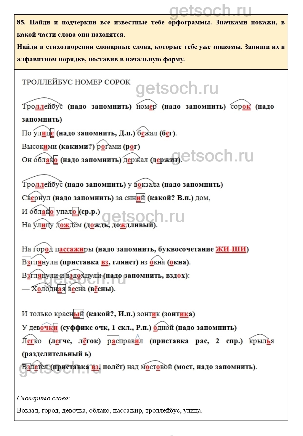85. Найди и подчеркни все известные тебе орфограммы. Значками покажи, в какой части слова они находятся.