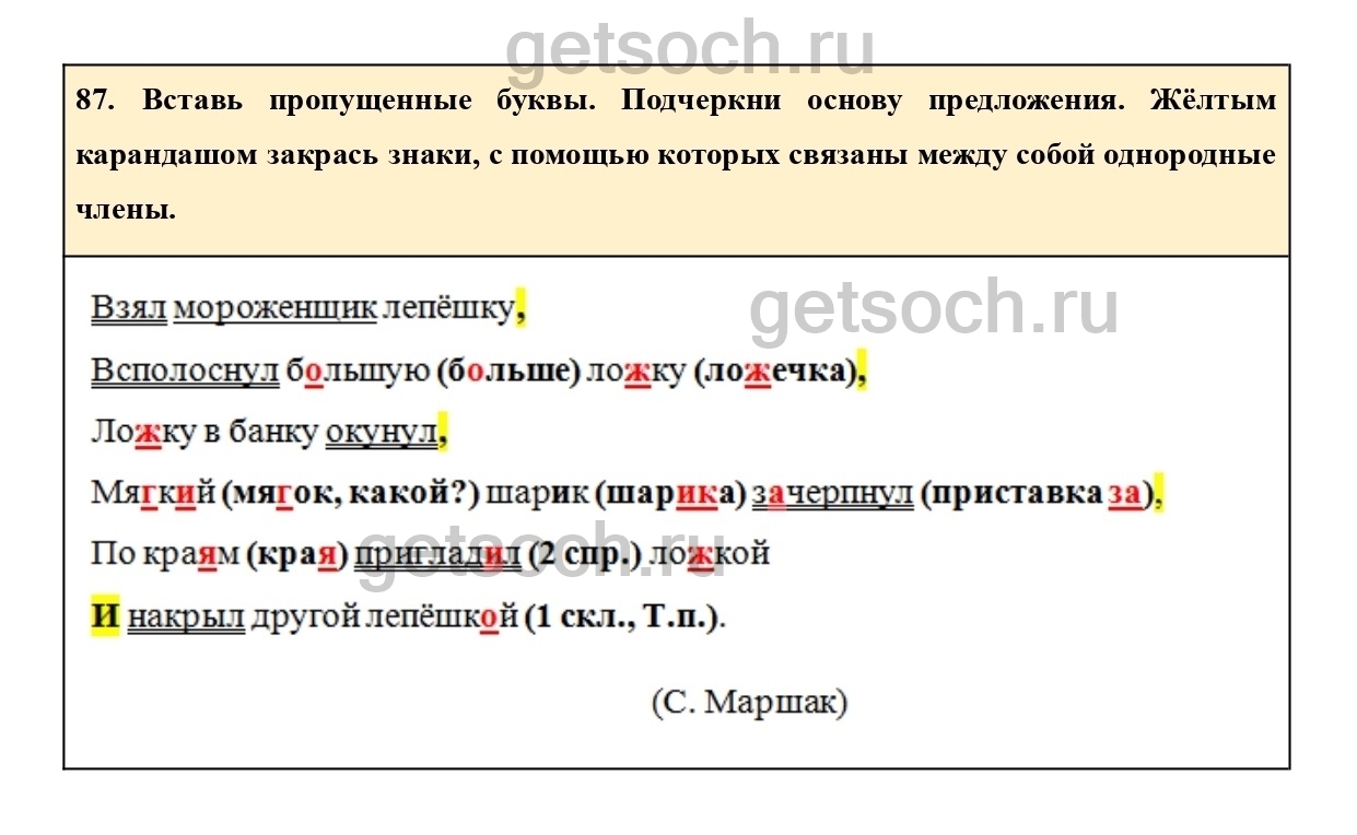 87. Вставь пропущенные буквы. Подчеркни основу предложения. Жёлтым карандашом закрась знаки, с помощью которых связаны между собой однородные члены.
