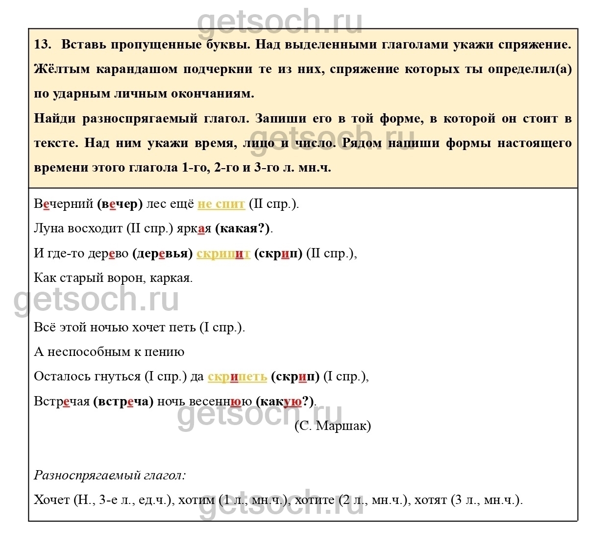 13. Вставь пропущенные буквы. Над выделенными глаголами укажи спряжение. Жёлтым карандашом подчеркни те из них, спряжение которых ты определил(а) по ударным личным окончаниям.