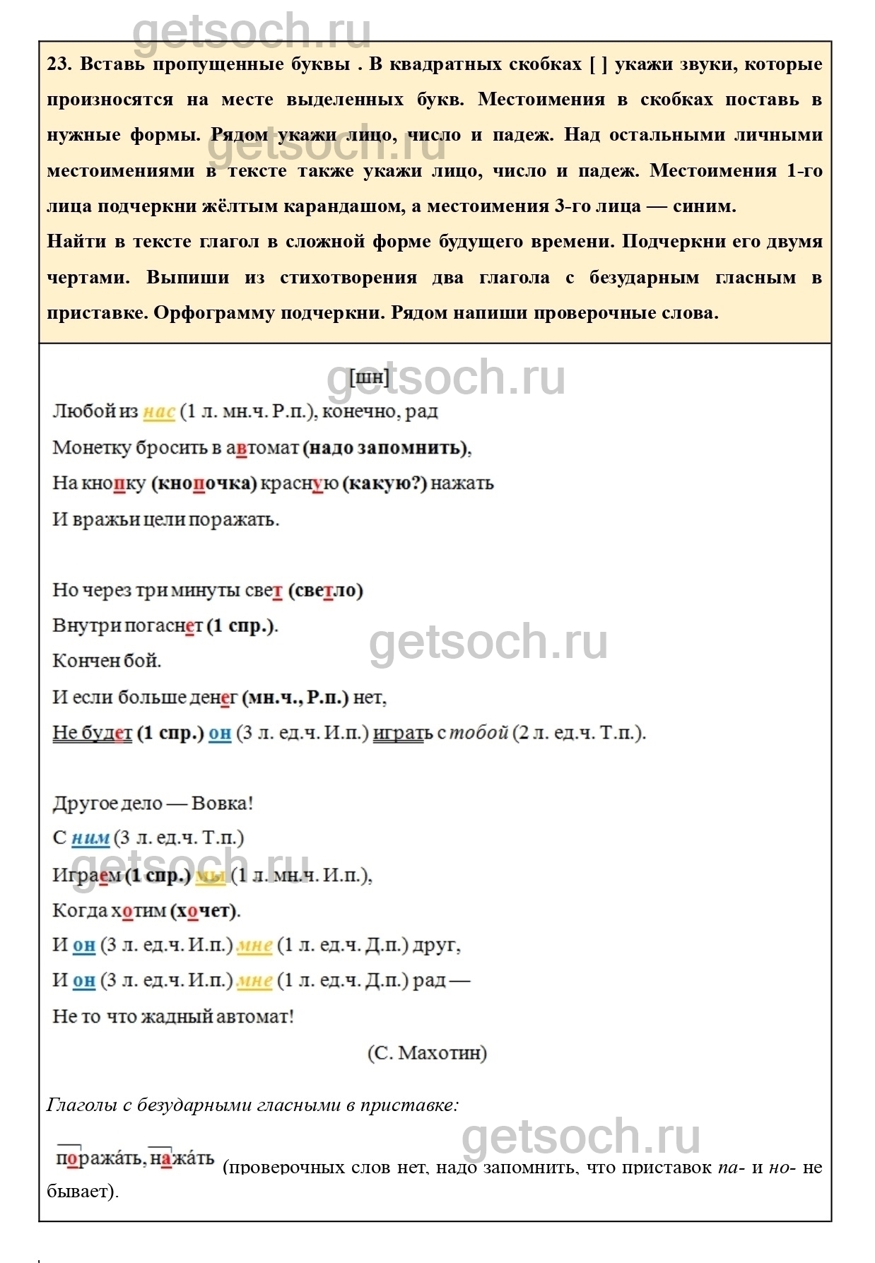 23. Вставь пропущенные буквы . В квадратных скобках [ ] укажи звуки, которые произносятся на месте выделенных букв. Местоимения в скобках поставь в нужные формы. Рядом укажи лицо, число и падеж. Над остальными личными местоимениями в тексте также укажи лицо, число и падеж. Местоимения 1-го лица подчеркни жёлтым карандашом, а местоимения 3-го лица — синим.
