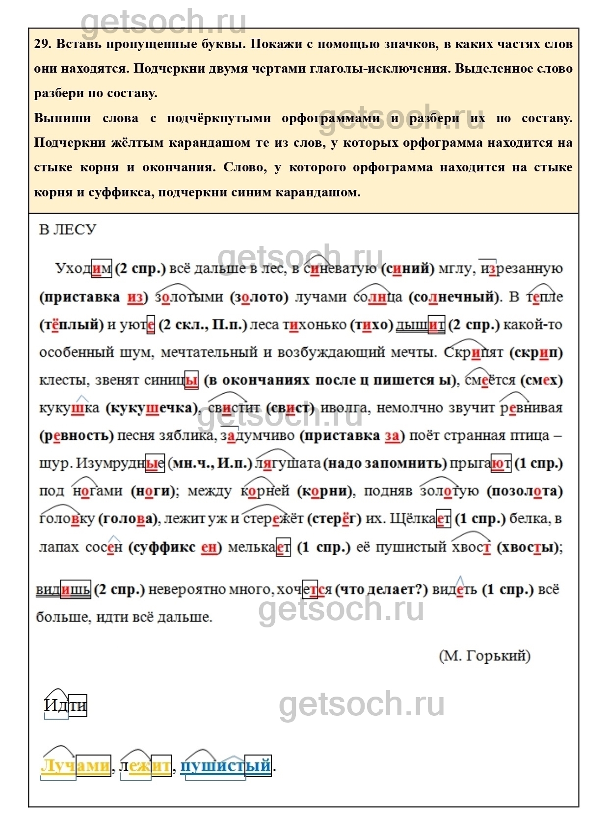 29. Вставь пропущенные буквы. Покажи с помощью значков, в каких частях слов они находятся. Подчеркни двумя чертами глаголы-исключения. Выделенное слово разбери по составу.