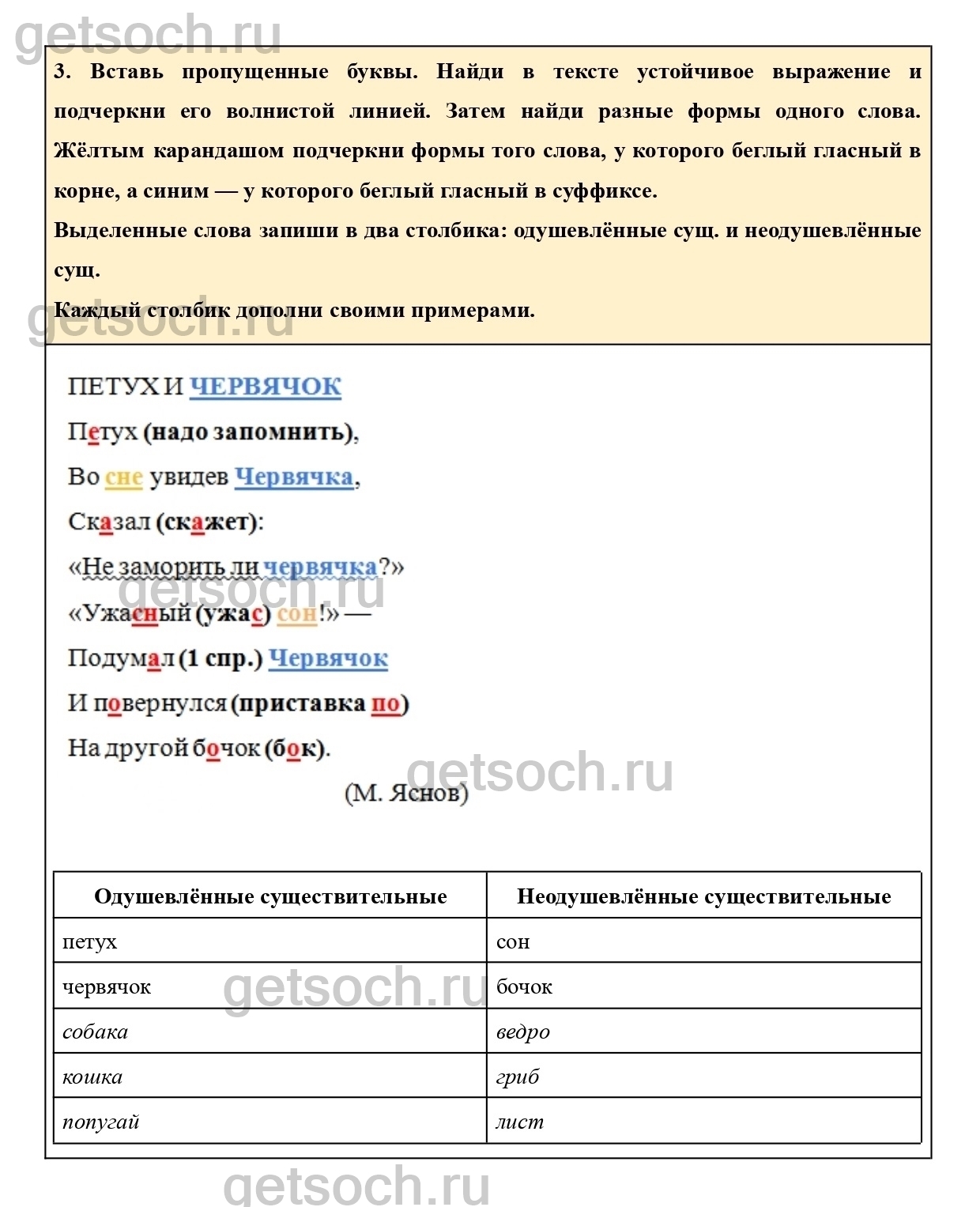 3. Вставь пропущенные буквы. Найди в тексте устойчивое выражение и подчеркни его волнистой линией. Затем найди разные формы одного слова. Жёлтым карандашом подчеркни формы того слова, у которого беглый гласный в корне, а синим — у которого беглый гласный в суффиксе.